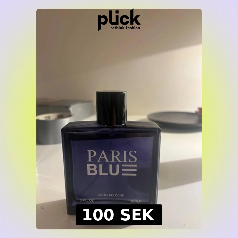 Paris Blue Eau de Cologne i en stilren, mörkblå glasflaska med svart lock. Flaskan har en fyrkantig form och rymmer 100 ml. Texten på framsidan är vit och designen känns modern och enkel.
