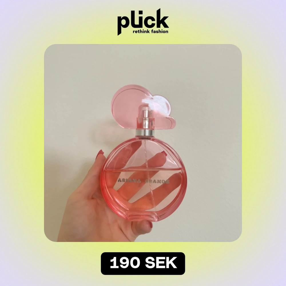 Säljer en superfin parfym från Ariana Grande. Flaskan är rund och rosa med ett gulligt molnformat lock. Den kommer med en vit molnformad bas som gör den extra söt att ha framme. Perfekt för dig som älskar söta och fruktiga dofter! 💖