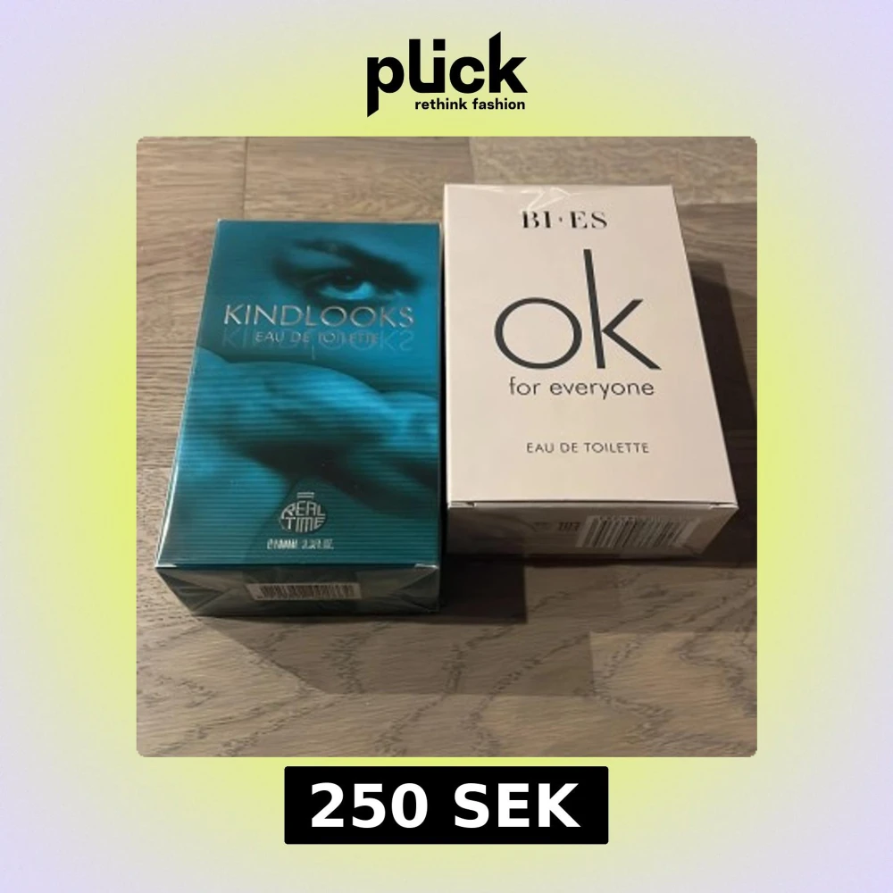 Två Eau de Toilette-parfymer: Kindlooks från Real Time i en turkos förpackning och Bi-es ok for everyone i en vit förpackning. Båda flaskorna innehåller 100 ml doft. Perfekt för den som vill ha en fräsch och mångsidig doft eller att layera med! Är man bara intresserad av den ena går de också bra. PRISET FÖR ANNONSEn AVSER OM MAN VILL KÖPA BÅDA!