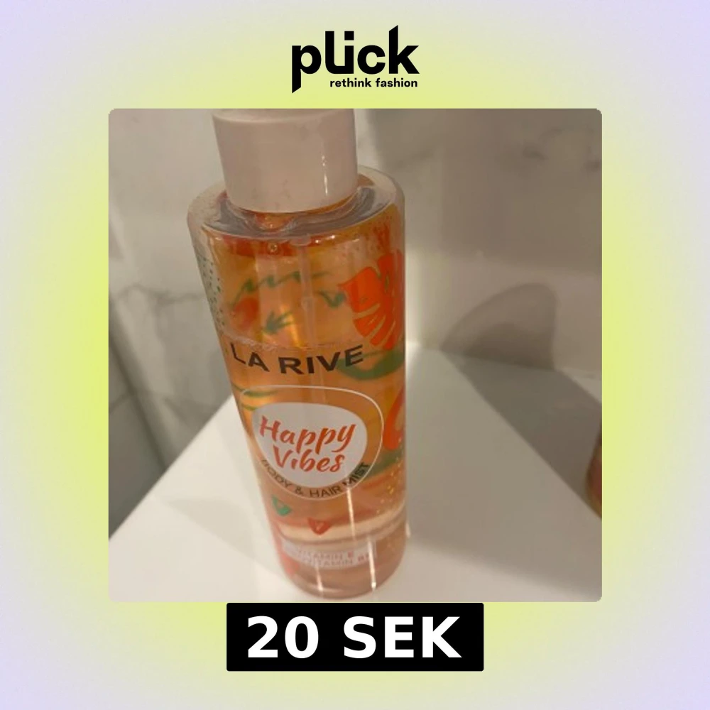Fräsch body & hair mist från La Rive i doften Happy Vibes. Kommer i en genomskinlig plastflaska med vit kork och färgglad etikett med orange och gröna detaljer. Perfekt för att ge både kropp och hår en uppfriskande doft.