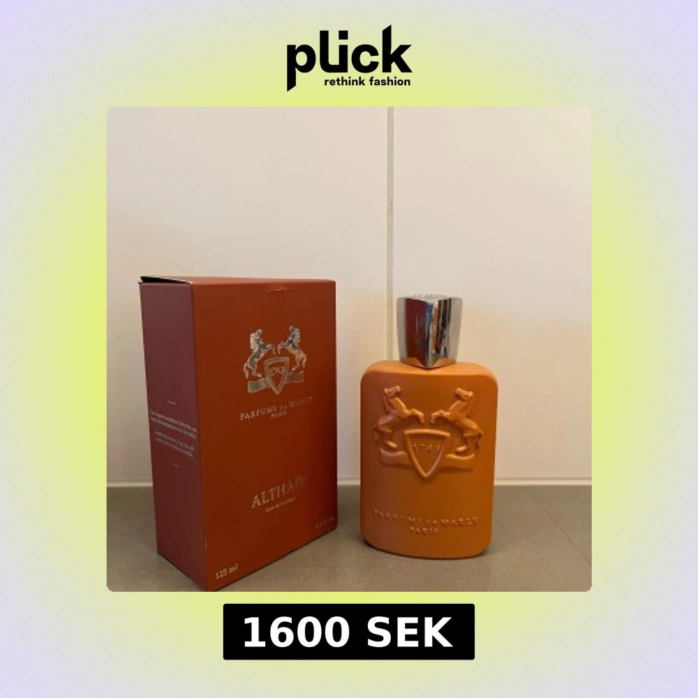 Exklusiv parfym Althaïr från Parfums de Marly i en snygg orange flaska med silverfärgat lock och upphöjt hästmotiv. Flaskan rymmer 125 ml och kommer i matchande orange kartong. En lyxig och modern doftupplevelse från Paris. Priset ej hugget i sten vid snabbaffär