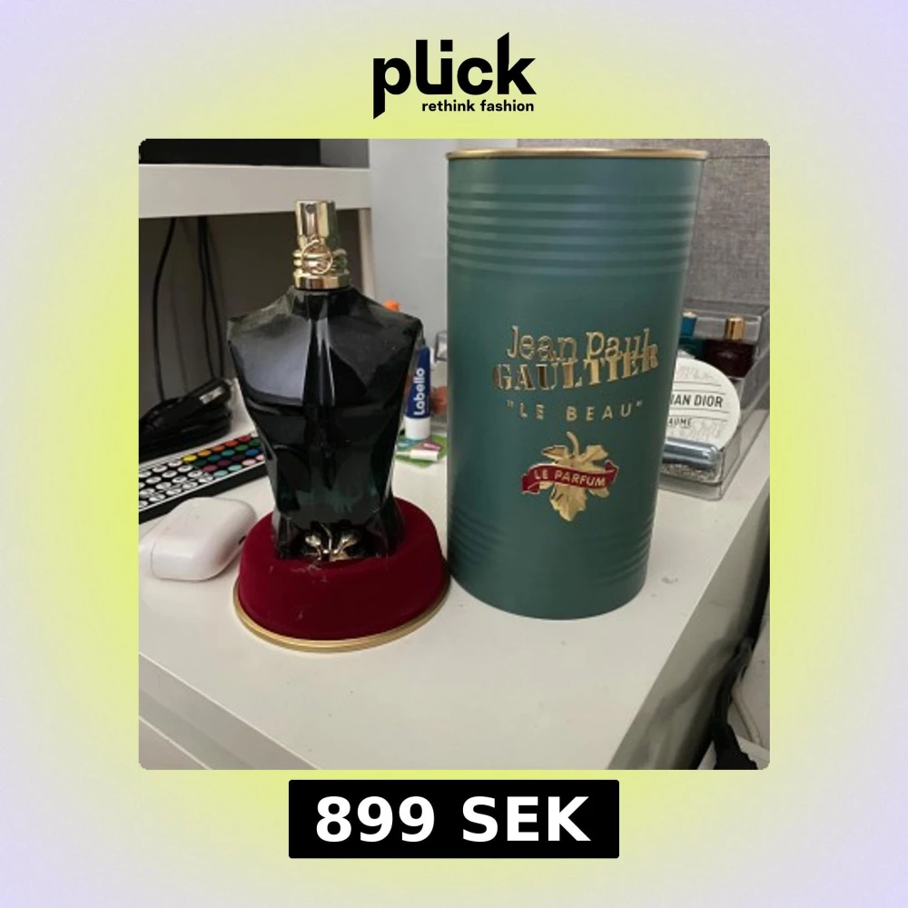 Säljer en Jean Paul Gaultier Le Beau Le Parfum med en cool svart flaska formad som en manlig torso och gulddetaljer. Kommer med original grön cylinderförpackning med guldfärgad text och dekor. Perfekt för dig som gillar unika och lyxiga dofter. Den är 125ml och det kanske är 120ml kvar jag har knappt använt den