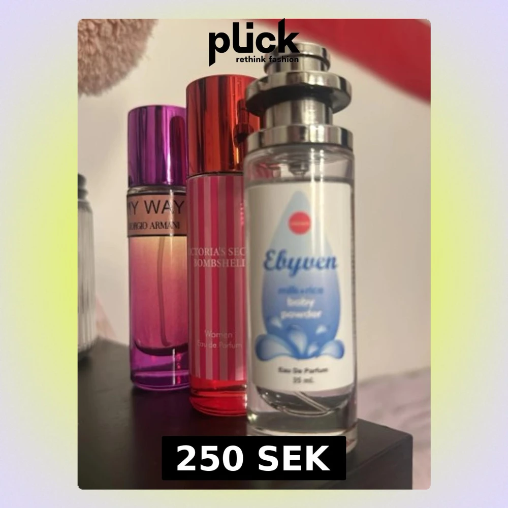 Upptäck tre favoriter: Giorgio Armani My Way, Victoria's Secret Bombshell och Ebyven Baby Powder. Perfekta storlekar för väskan, 35 ml på Ebyven. Snygga flaskor som ger din doftsamling en trendig touch.