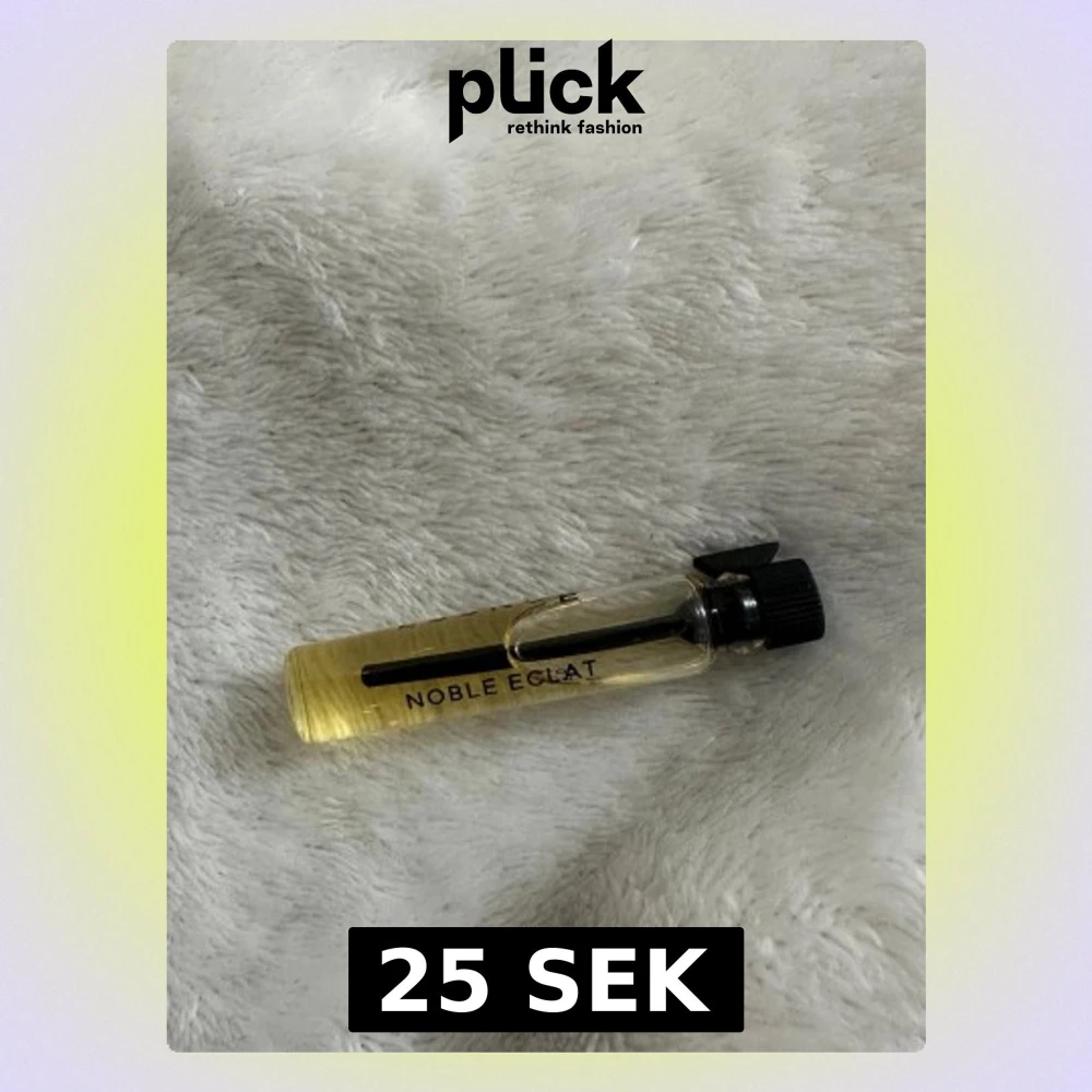 Litet parfymprov från Noble Eclat i genomskinlig glasflaska med svart skruvkork. Flaskan är cylinderformad och innehåller en ljusgul vätska. Perfekt att ha med i väskan eller testa en ny doft.