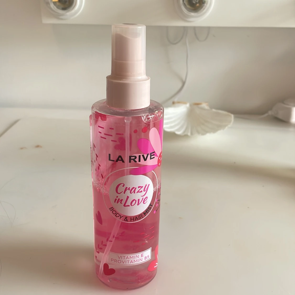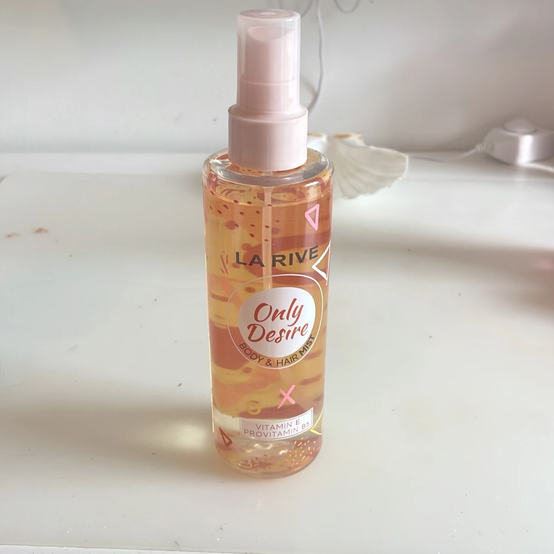 Två fräscha body & hair mists från La Rive: Only Desire i en orange flaska med guldiga detaljer och Crazy in Love i en rosa flaska med hjärtan. Båda innehåller vitamin E och provitamin B5. Perfekta för att fräscha upp både hår och kropp. Den rosa är ungefär använd till hälften men den gula har knappts användts. Skriv om du bara vill ha en.