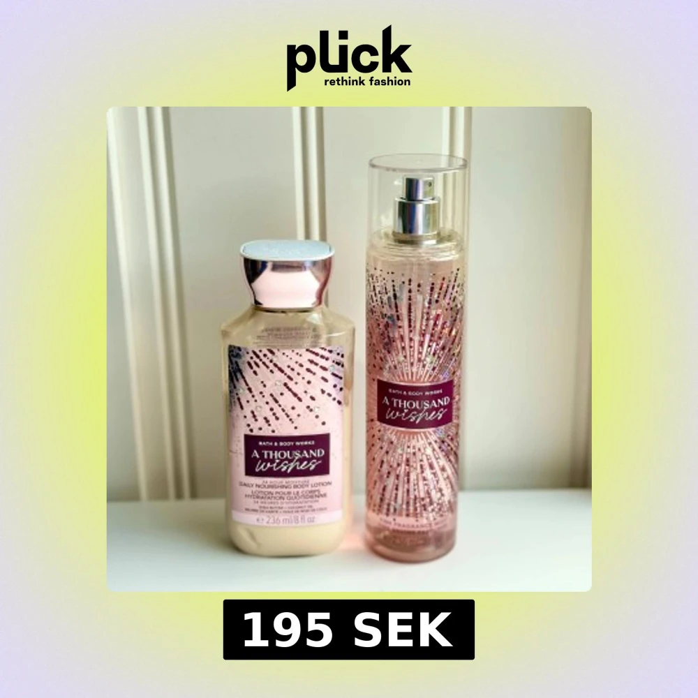 Bath & Body Works A Thousand Wishes Duo. Detta ser innehåller en body mist på 236 ml och en body lotion på 236 ml. Använd enligt bild. Givetvis förvarad mörkt och svalt.