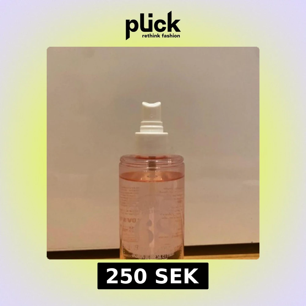 En fräsch parfymmist i en genomskinlig flaska med rosa vätska. Flaskan har en vit spraykork och ett elegant vitt lock med upphöjd text. Perfekt för en snabb uppfräschning under dagen.