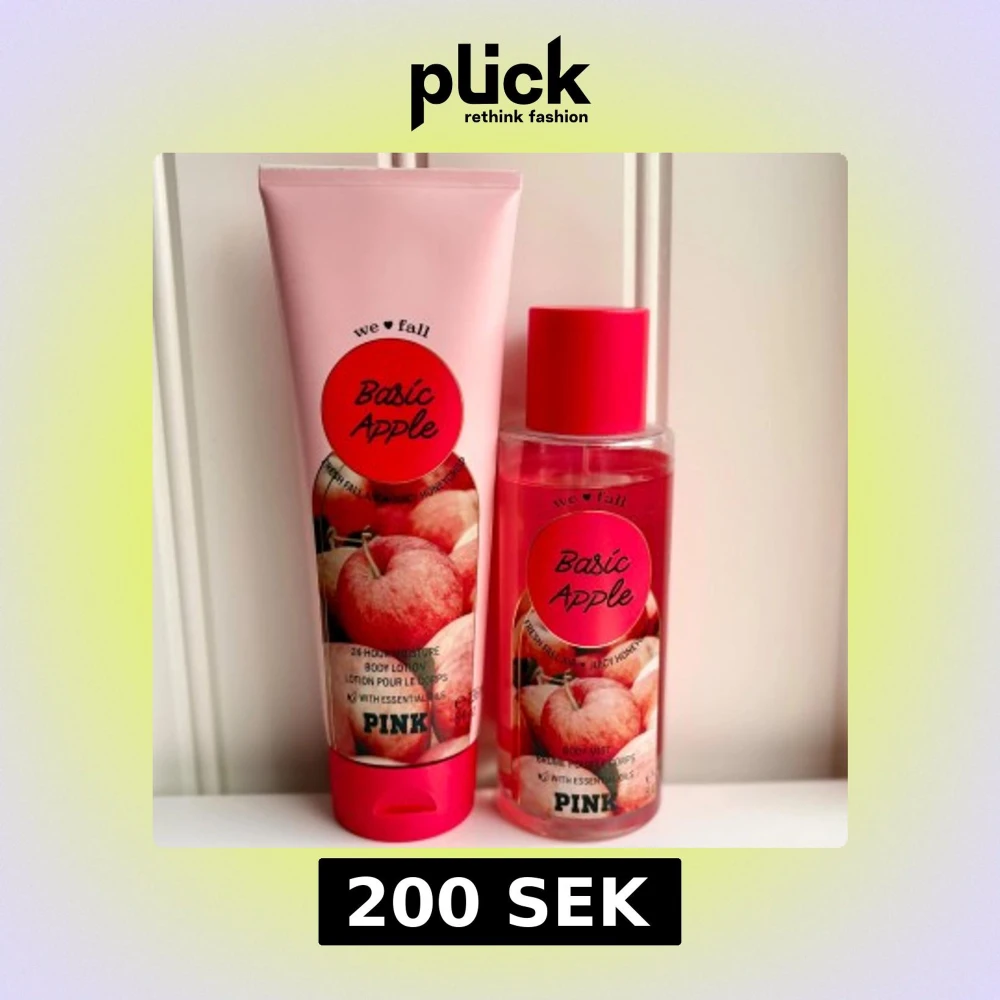 Från Victoria’s Secret PINK. Ett set med body mist (250 ml) och body lotion (236 ml) i doften Basic Apple. Perfekt för hösten! Mist använd enligt bild. Lotion enbart testad ett par gånger. Givetvis förvarade mörkt och svalt.