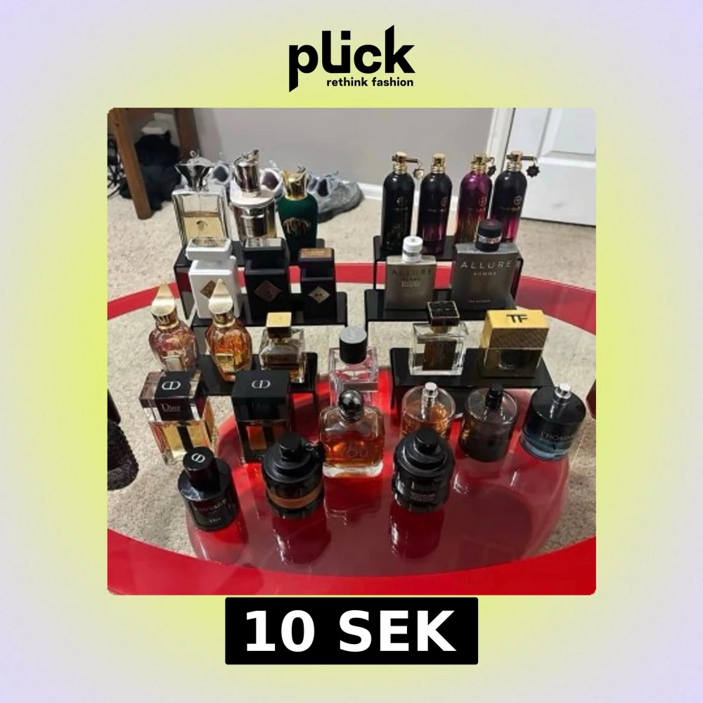 Stor samling exklusiva parfymer från märken som Dior, Tom Ford, Allure och andra. Flakongerna varierar i färg och form, med både fyrkantiga och runda designer i glas och metall. Flera flaskor har guld- eller svartdetaljer och eleganta lock. Perfekt för dig som älskar dofter! För byte