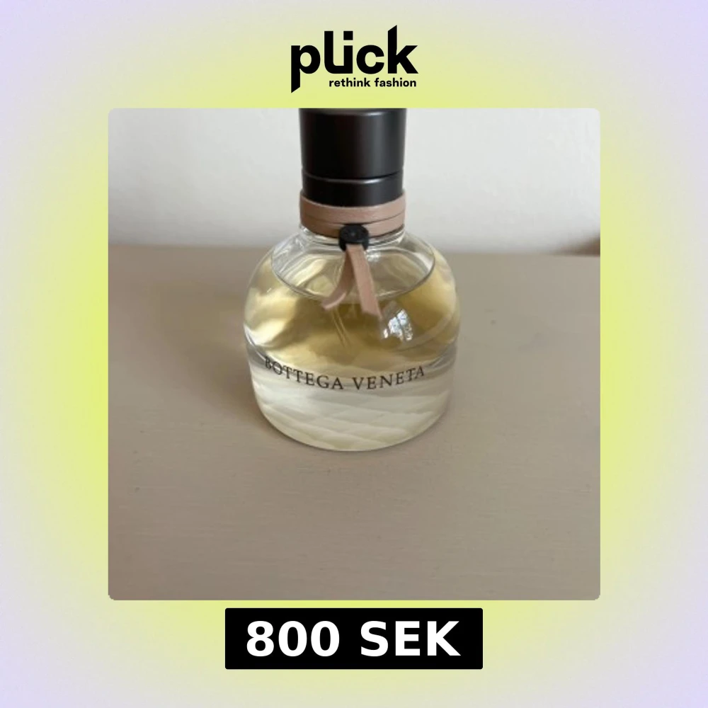 Använd Elegant parfym från Bottega Veneta i en rund glasflaska med ljusbeige band och svart kork. Flaskan har ett diskret rutmönster i glaset och parfymen är ljusgul. Perfekt för dig som gillar lyxiga och sofistikerade dofter.