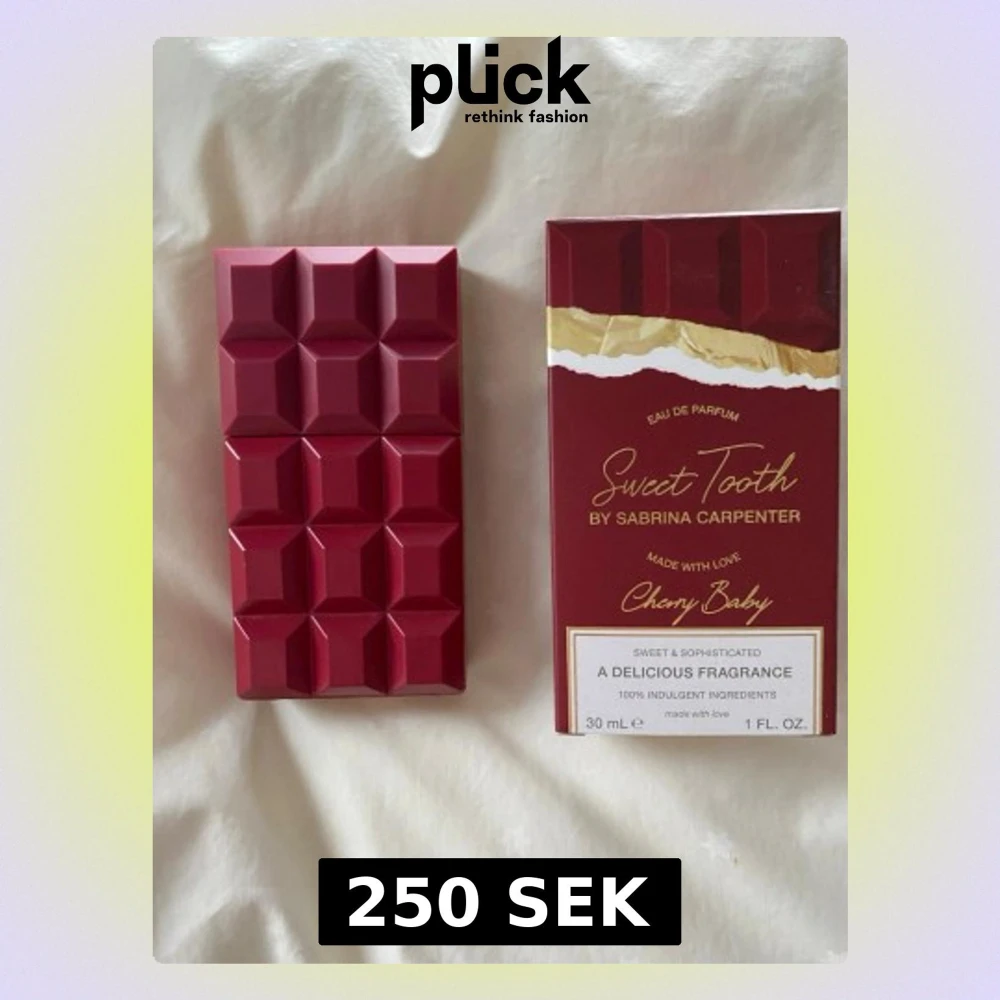 Parfymen Sweet Tooth Cherry Baby från Sabrina Carpenter kommer i en unik, mörkröd flaska formad som en chokladkaka. Förpackningen är också mörkröd med gulddetaljer och text i vitt och guld. Doften beskrivs som söt och sofistikerad med inslag av körsbär. Tagit max 10 sprut