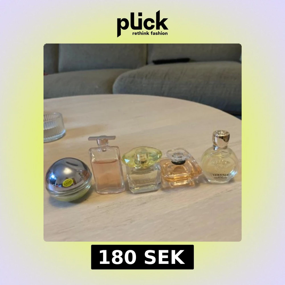 En samling av fem olika dofter i små flaskor(priset gäller alla fem💕)Versace Yellow Diamond(5 ml)Versace Eros Pour femme(5 ml) och Lancome Tresor(5 ml),är så gott som fulla bortsett från någon testning.Armani Idole(tror att det är 5ml)är testad lite mer.Dkny Be Delicious(från början 7 ml)har endast lite kvar i flaskan)