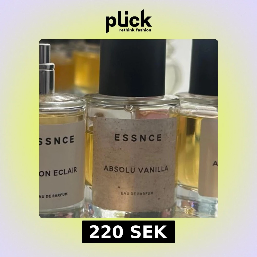 En parfym från ESSNCE med namnet Absolu Vanilla. Flaskan är rund med transparent glas och svart kork. Etiketten är enkel och ljus med svart text. Innehållet är gyllengult och flaskan har en minimalistisk design.