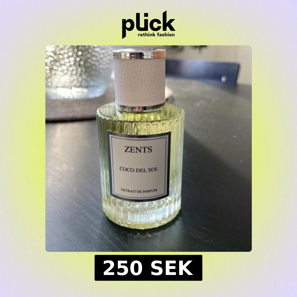 Lyxig parfym från Zents i doften Coco Del Sol. Flaskan är genomskinlig med räfflad yta och har en silvrig kork med vit läderdetalj. Parfymen har en ljusgul nyans och ger en exklusiv känsla på hyllan. Endast ett sprut testat!