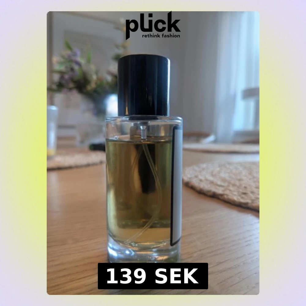 En stilren parfymflaska med minimalistisk design och svart kork. Perfekt för dig som vill ha en enkel och snygg accessoar på hyllan.
