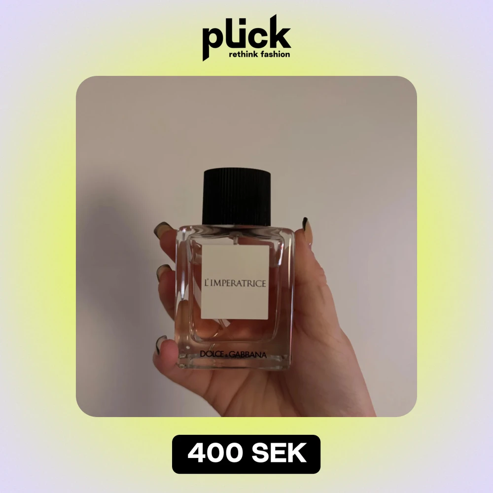 Säljer en elegant parfymflaska av L'Imperatrice från Dolce & Gabbana. Flaskan är genomskinlig med en stilren vit etikett och ett svart lock. Perfekt för den som älskar fräscha och fruktiga dofter. Passar både till vardags och fest!