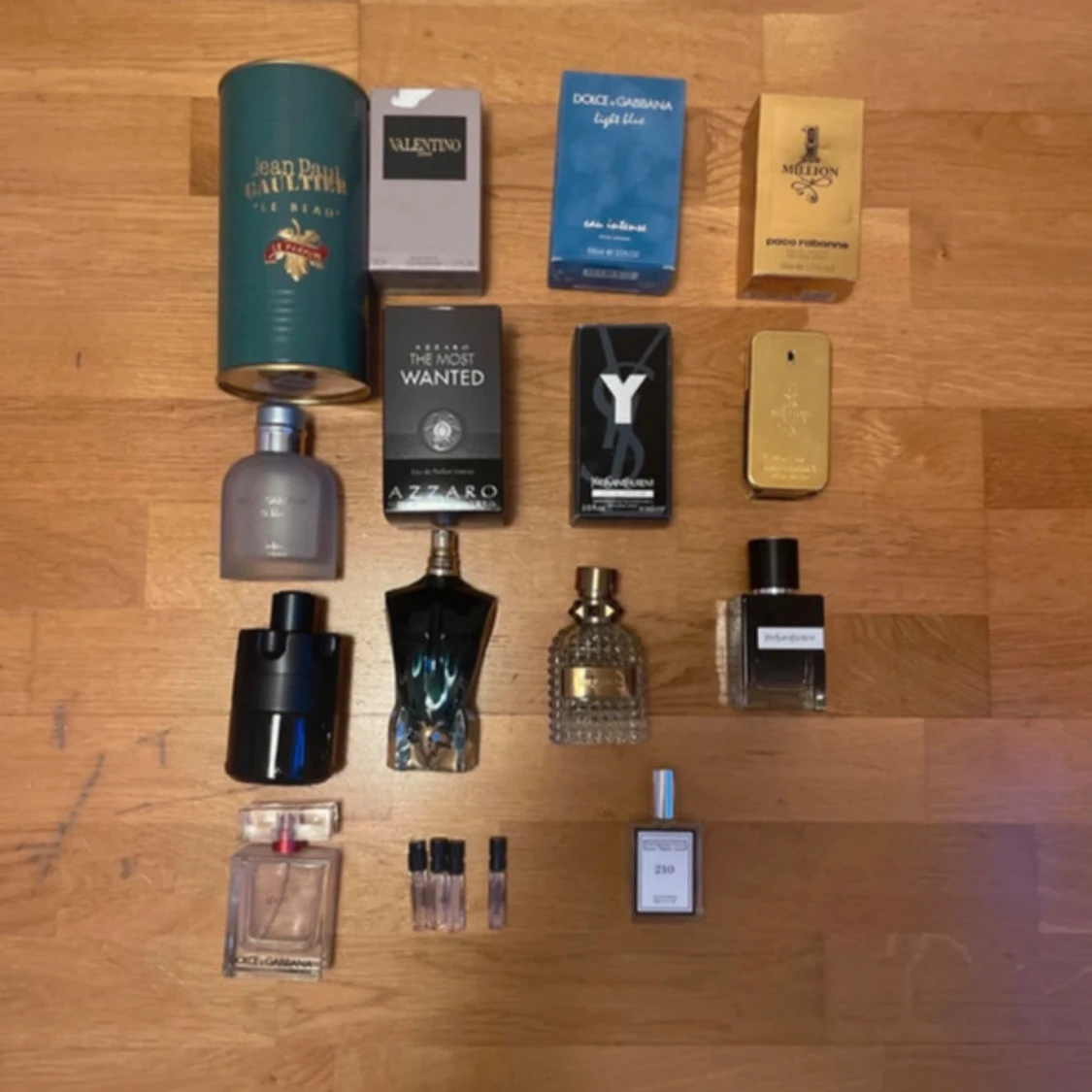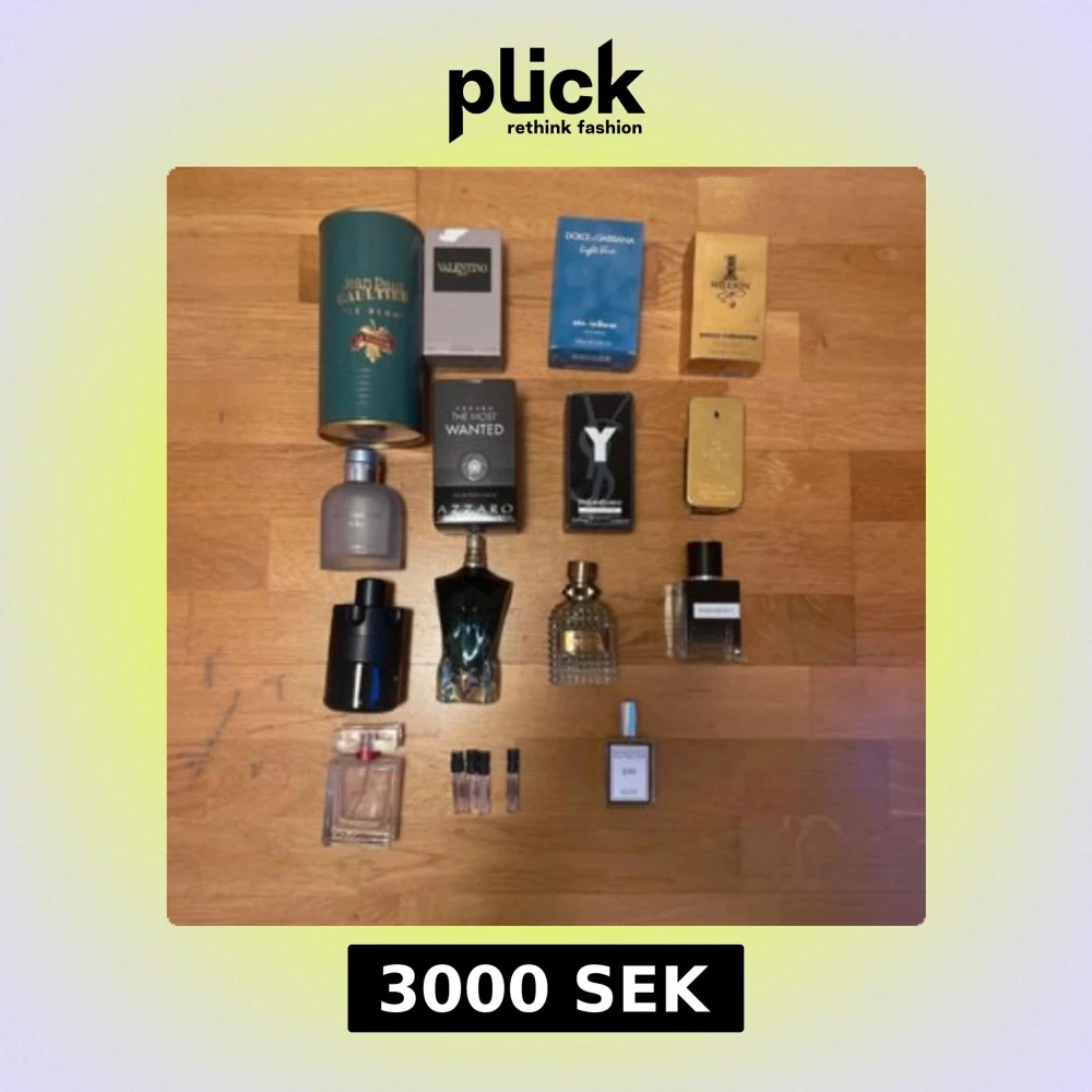 Samling med flera herrparfymer från kända märken som Jean Paul Gaultier, Valentino, Dolce & Gabbana, Paco Rabanne, Yves Saint Laurent och Azzaro. Flakonger i olika former och färger, bland annat blå, svart, guld och transparent. Inkluderar både fullstora flaskor och miniatyrprover.