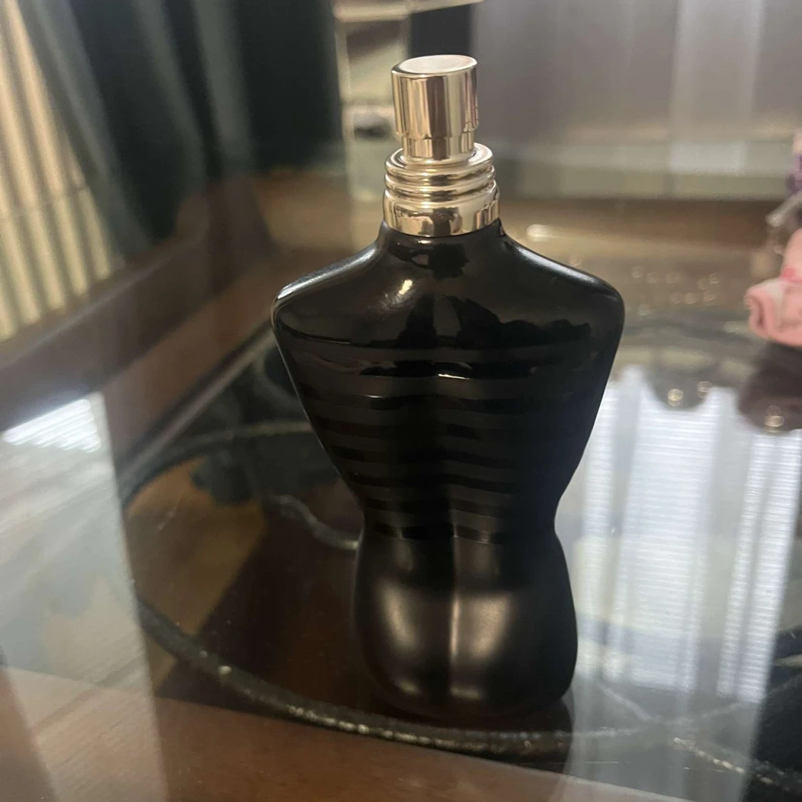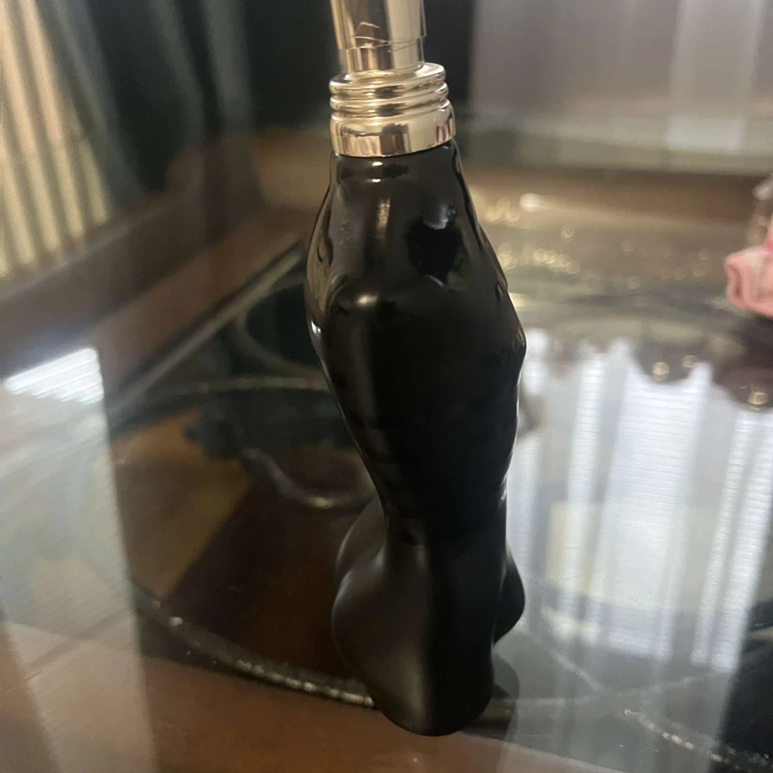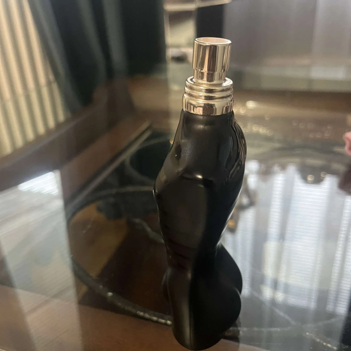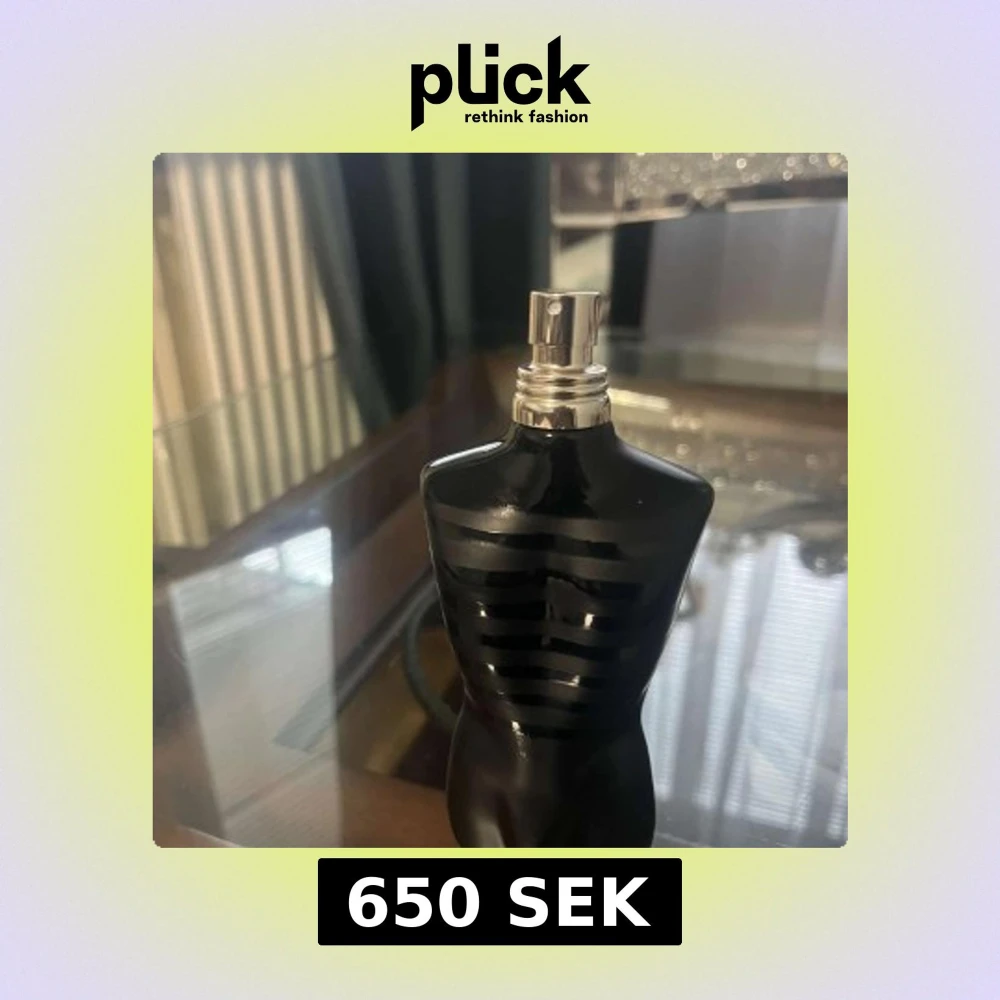 Säljer en ikonisk Jean Paul Gaultier Le Male parfym i svart, matt flaska formad som en manlig torso med blanka svarta ränder. Flaskan har en metallisk spraytopp och är tillverkad i glas. Perfekt för dig som gillar stilrena och unika doftflaskor.