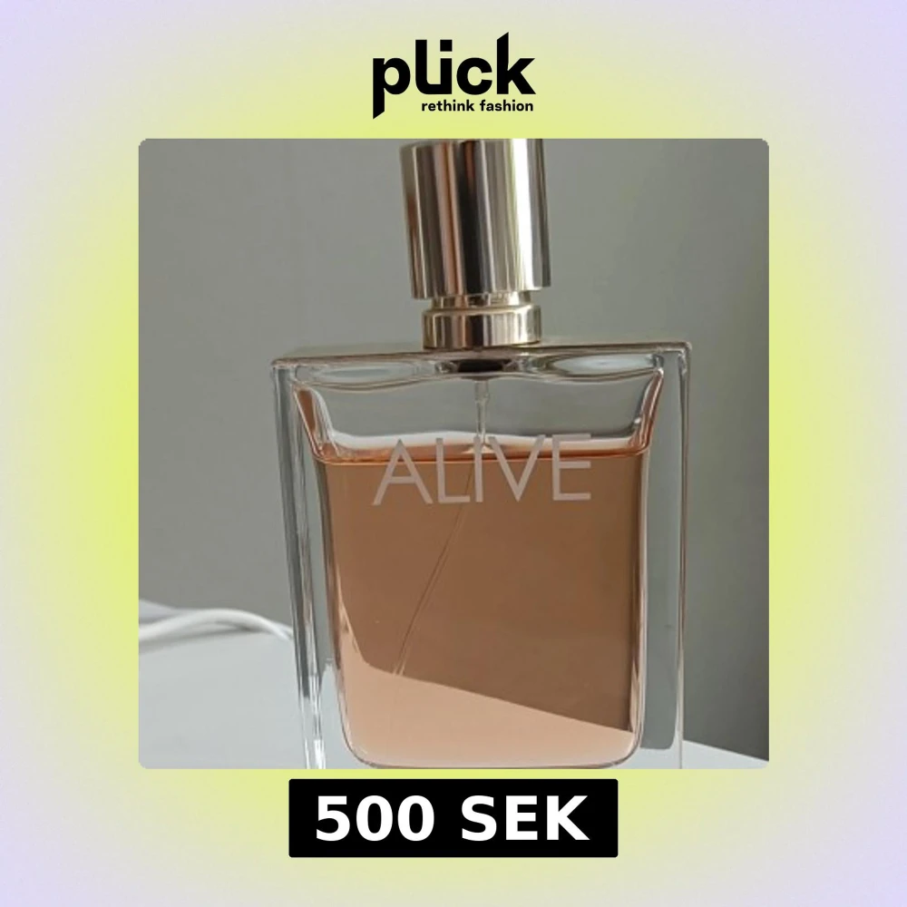 Elegant parfymflaska med namnet 'Alive' från Boss. Flaskan är rektangulär med en stilren design och har en gyllene kork. Innehållet är en varm, bärnstensfärgad vätska som ger en lyxig känsla.