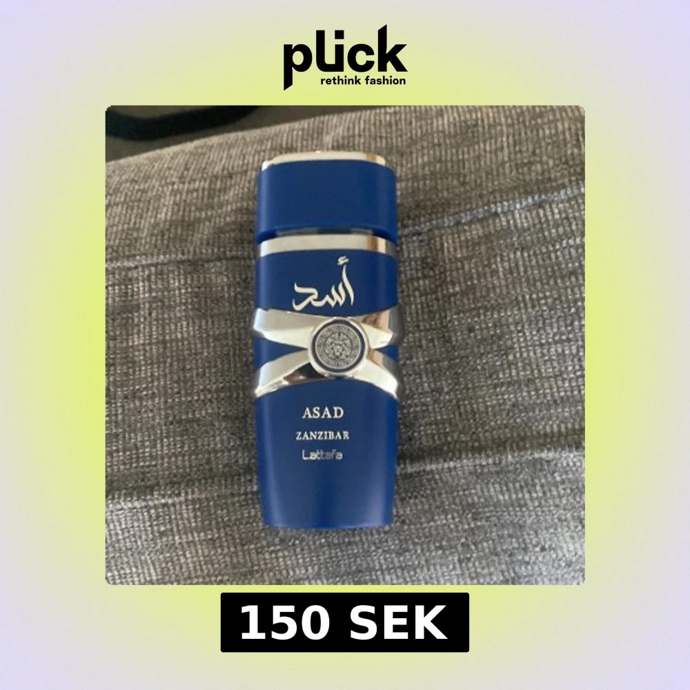 Säljer en Asad Zanzibar parfym från Lattafa i en snygg blå flaska med silverdetaljer och arabiska inskriptioner. Flaskan har en modern design och känns lyxig med sin matta finish och metalliska inslag. Priset går att diskutera vid snabba köp
