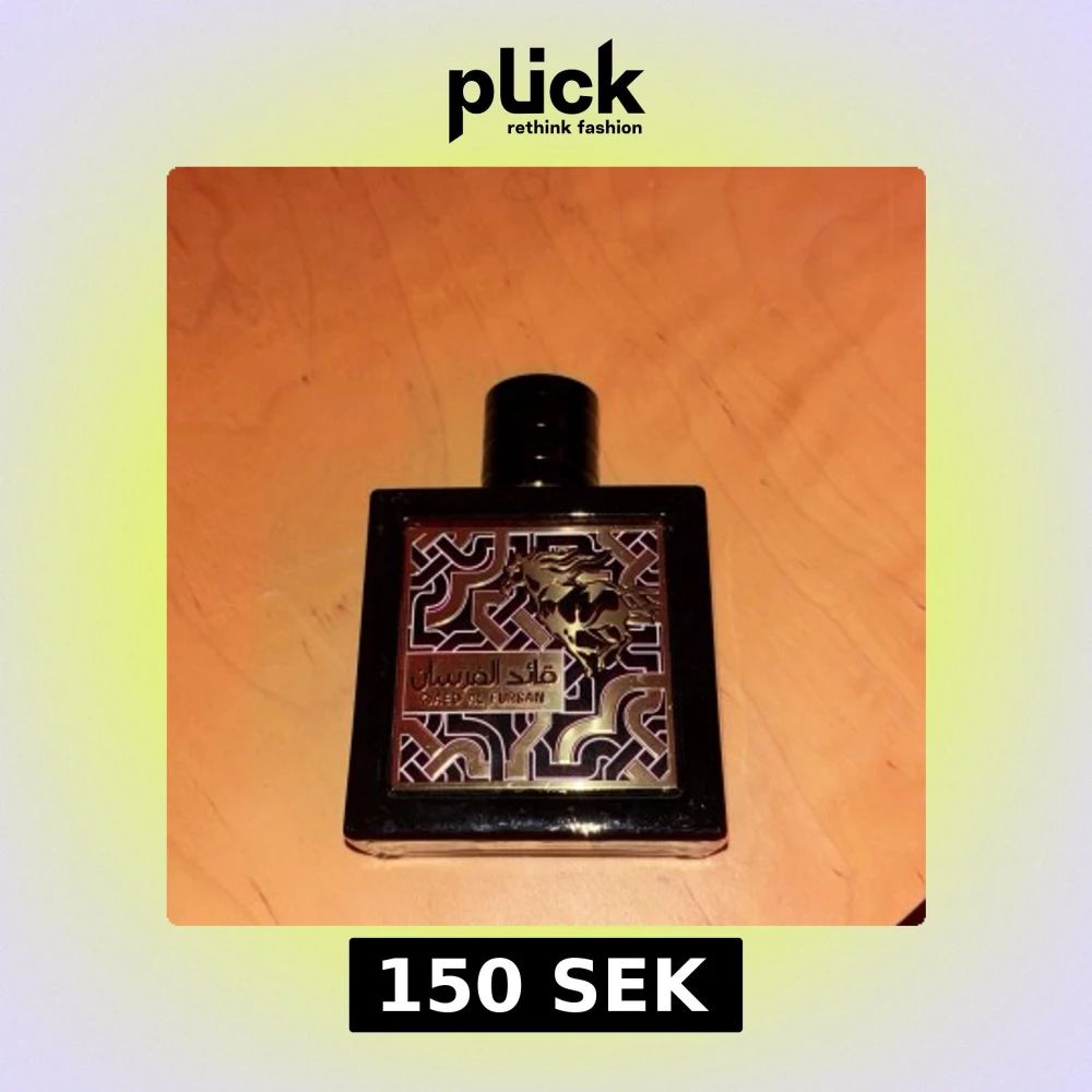 Säljer en exklusiv parfymflaska från Oud Al Fursan. Flaskan är fyrkantig och svart med ett dekorativt mönster och en guldfärgad häst på framsidan. Korken är svart och rund. Perfekt för dig som gillar orientaliska dofter. 100 ml kvar i flaskan oanvänd
