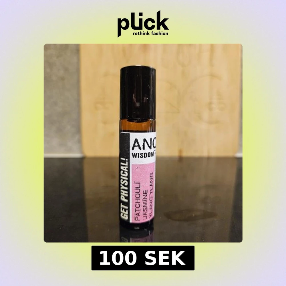Roll-on parfym med doft av patchouli, jasmin och ylang ylang. Flaskan är liten, cylinderformad och gjord av brunt glas med svart plastlock. Etiketten är svart, vit och rosa med texten 'GET PHYSICAL!'. Perfekt att ha med i väskan.