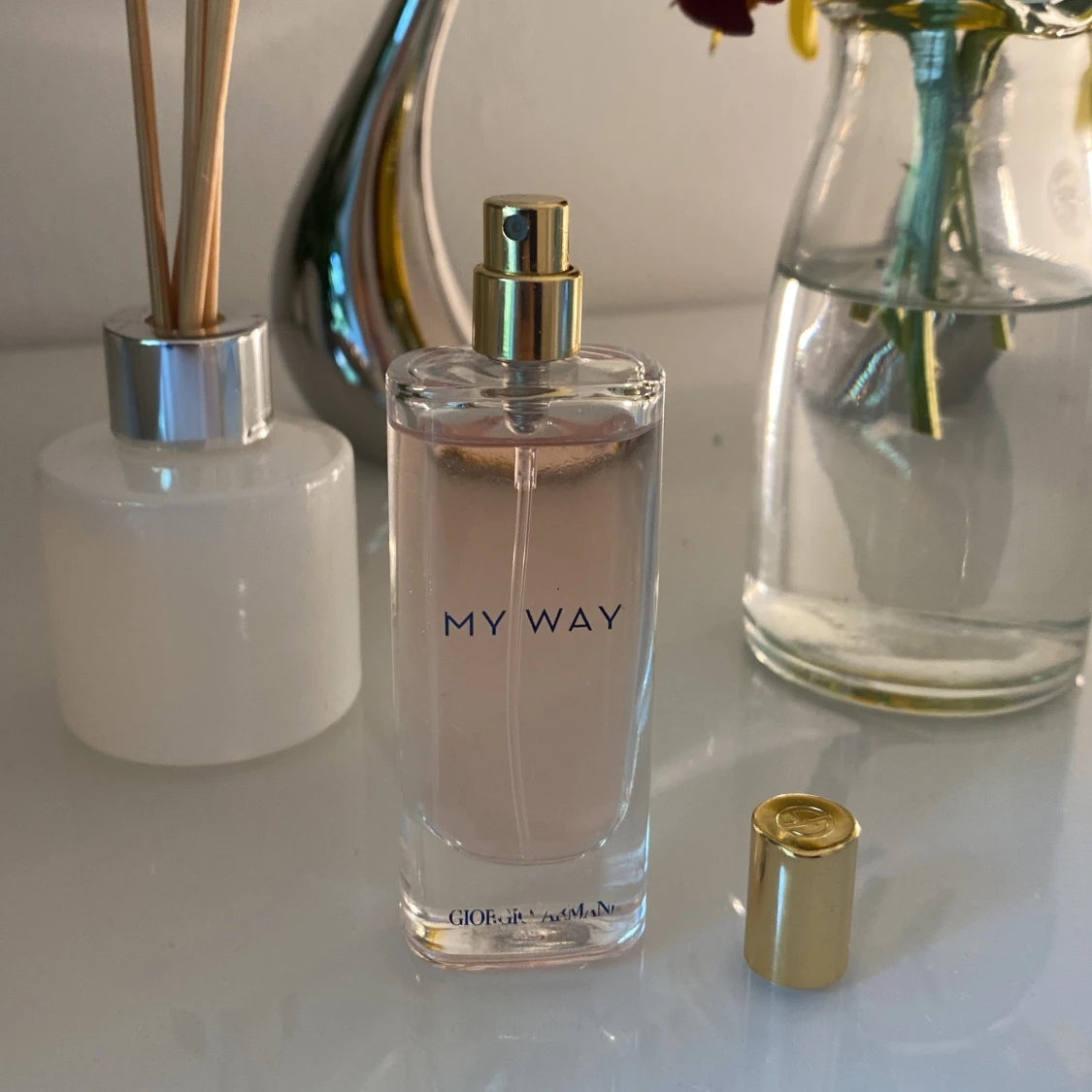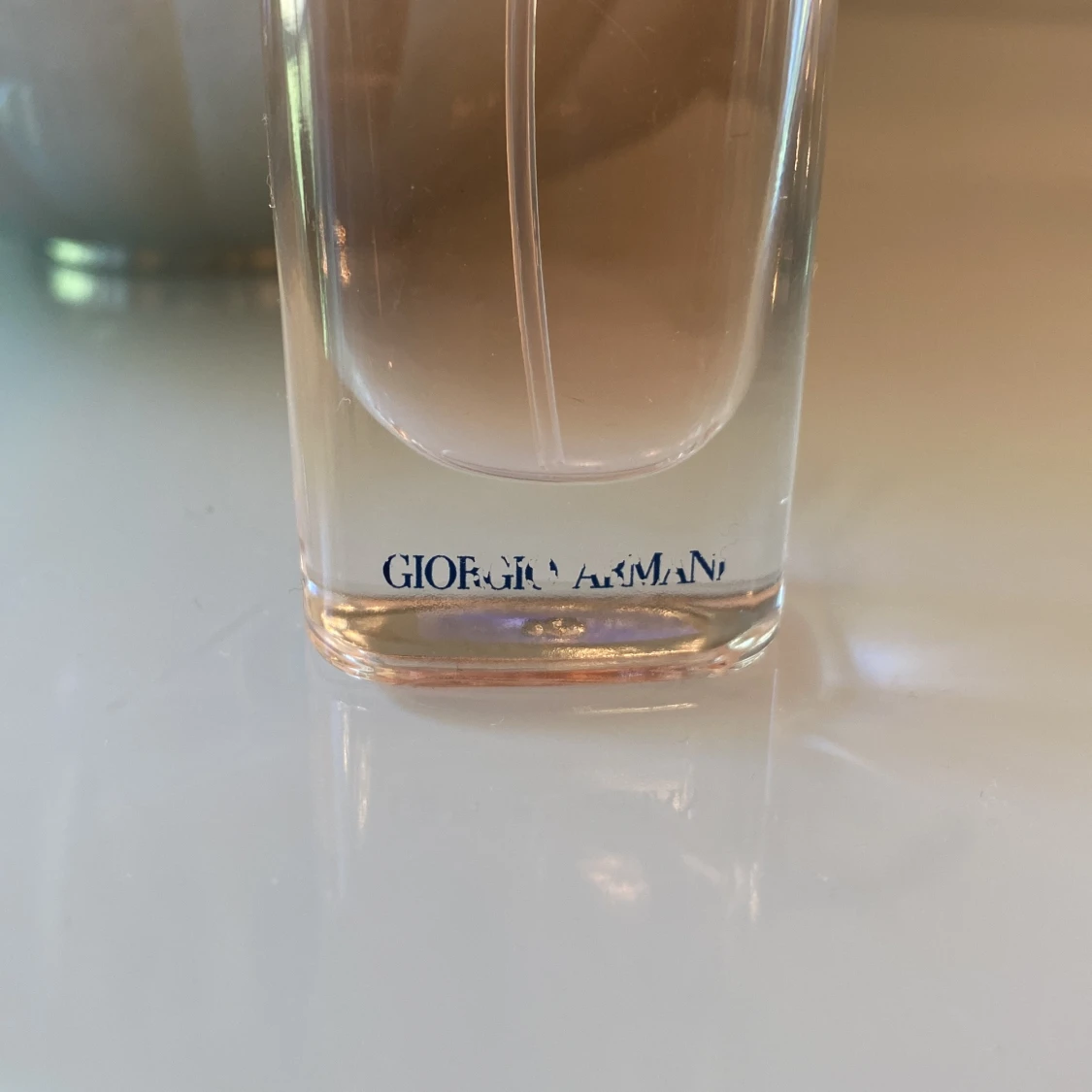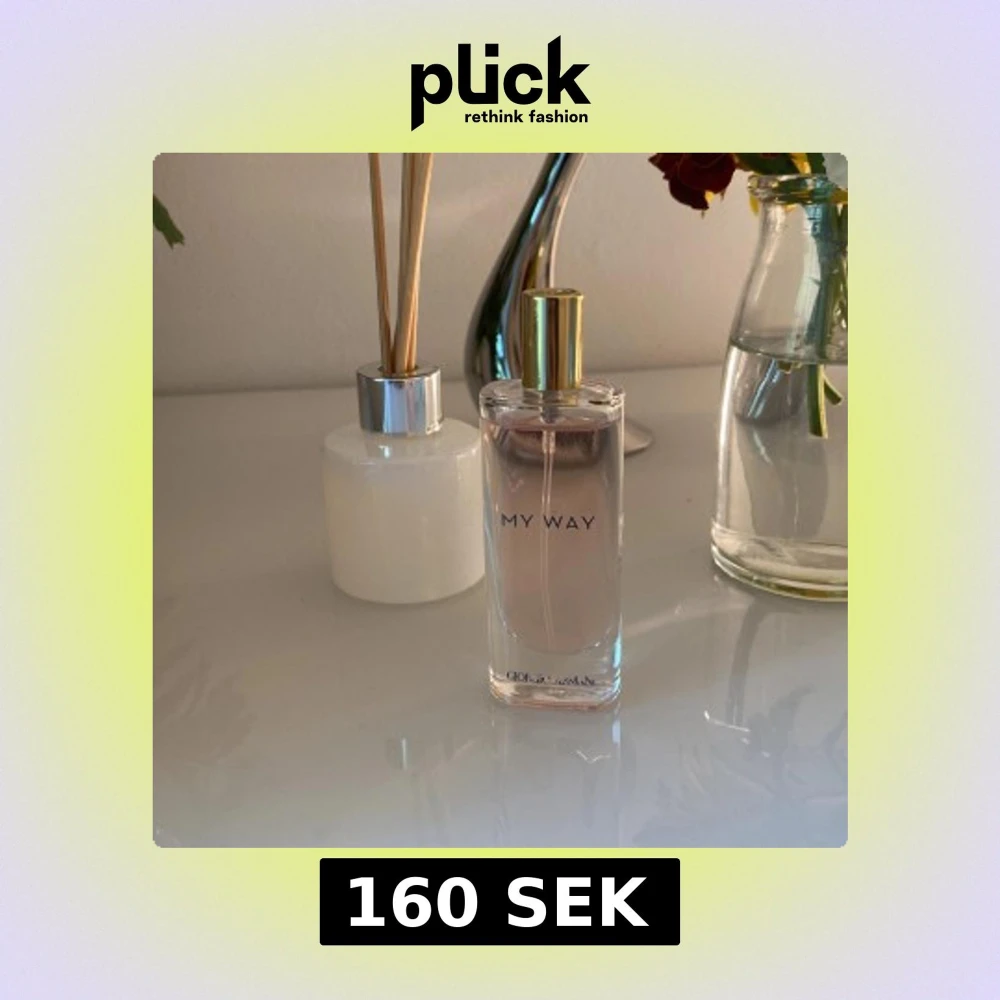 Säljer en elegant parfymflaska från Giorgio Armani, My Way. Flaskan är genomskinlig med ljusrosa doftvätska och har en stilren guldig spraykork. Rymmer 15 ml och har en modern, minimalistisk design som känns lyxig och fräsch. Texten längst ner på flaskan har tyvärr blivit lite sliten. 😢