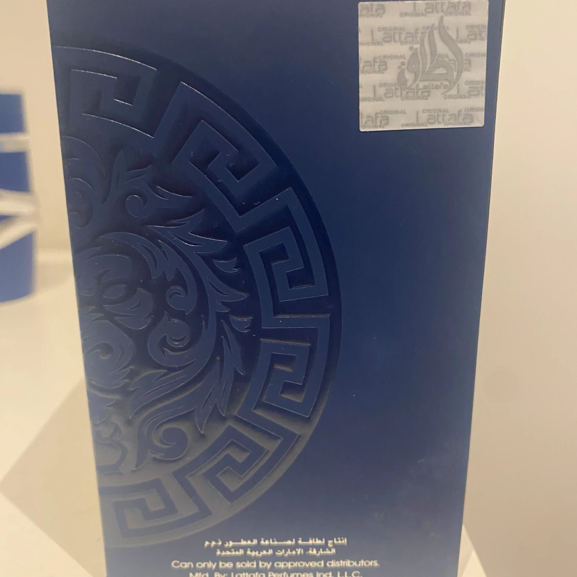 Elegant parfymflaska i djupblått med silverdetaljer. Asad Zanzibar från Lattafa erbjuder en unik doftupplevelse med noter av citrus och kanel. Flaskan har en stilren design med arabiska inskriptioner och ett dekorativt mönster. Perfekt för den som söker en exotisk och sofistikerad doft.