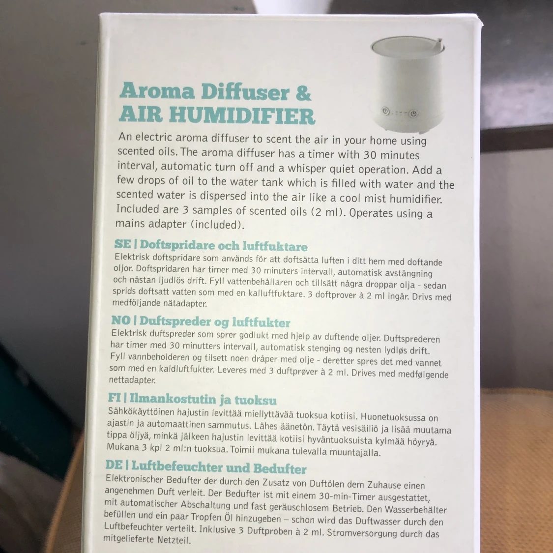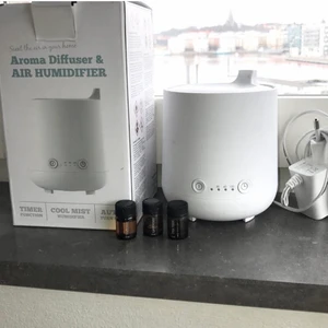 ”Aroma diffuser”/doftspridare och luftfuktare. KAN SÄNKA PRIS VID SNABBT KÖP. Använd några få gånger och har inga defekter. Jätteavkopplande att ha på om man är stressad och ger en behaglig doft till hela ens rum som också avsvalkar😌Kommer med förpackningen där alla instruktionspapper ligger i! Kommer med dessa tre dofterna, Orange har inte används alls, medans lavendel och Tea tree finns för ca 2-3 användningar till. Sedan när de tagit slut så kan man köpa vilken doftolja som helst och använda Skriv privat för frågor!💓