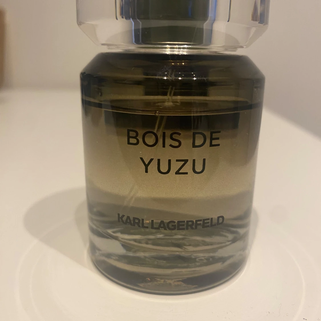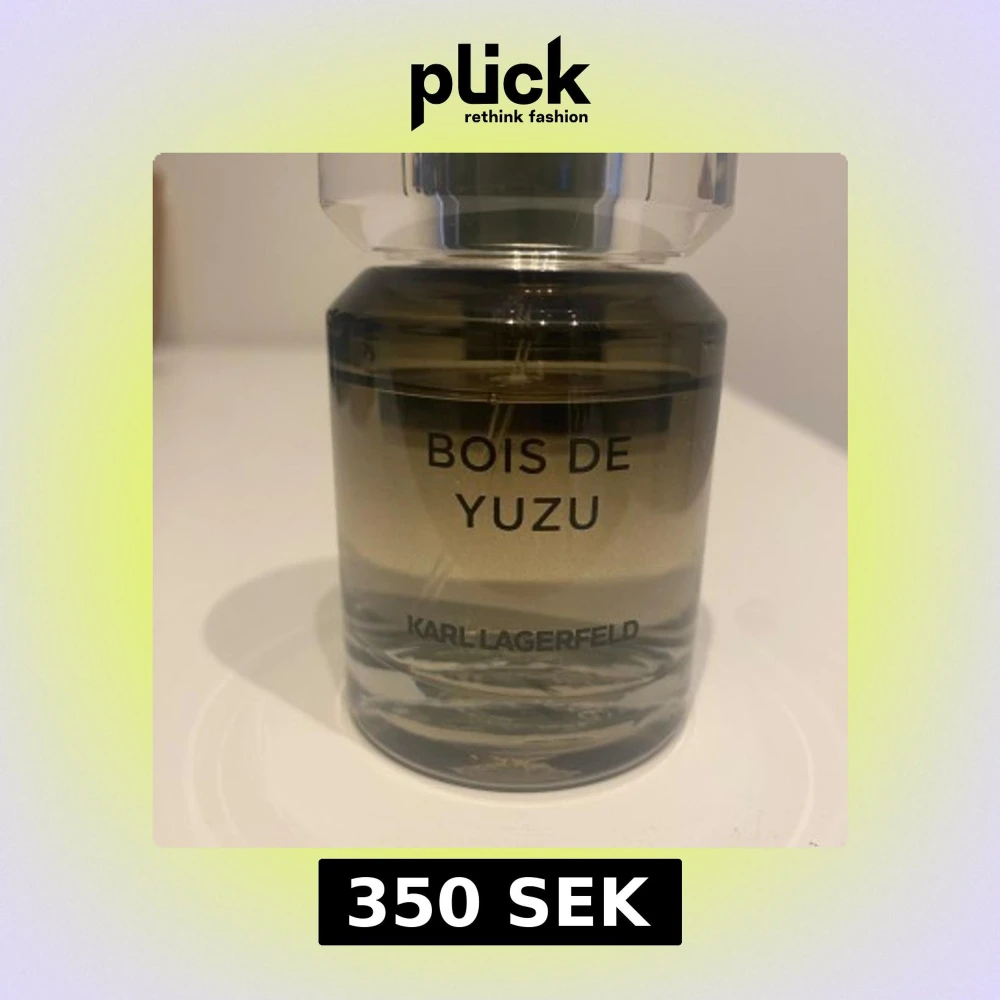Säljer en elegant Bois de Yuzu parfym från Karl Lagerfeld. Flaskan har en stilren design med en transparent och mörkgrön ton. Perfekt för den som söker en unik och fräsch doftupplevelse.