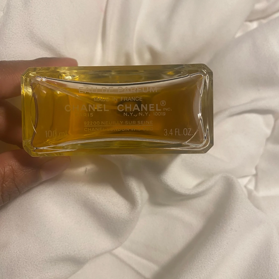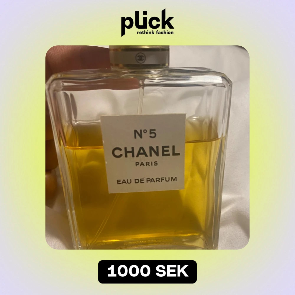 Elegant och tidlös Chanel N°5 Eau de Parfum i en klassisk rektangulär flaska med en stilren etikett. Den gyllene vätskan ger en lyxig känsla. Perfekt för den som älskar ikoniska dofter.