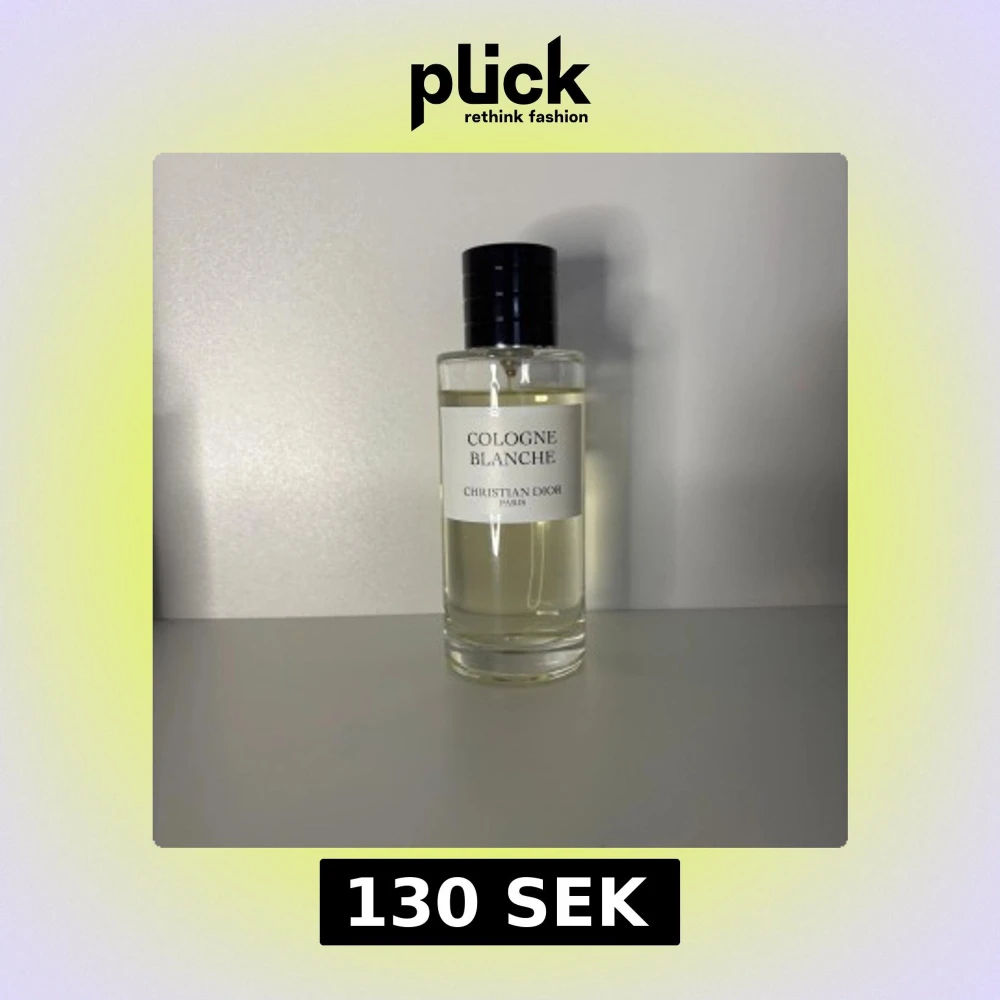 Exklusiv parfymflaska från Christian Dior, Cologne Blanche. Flaskan är cylindrisk i genomskinligt glas med svart lock och vit etikett. Innehållet är ljust gult. En stilren och lyxig doft för dig som gillar klassiska parfymer.