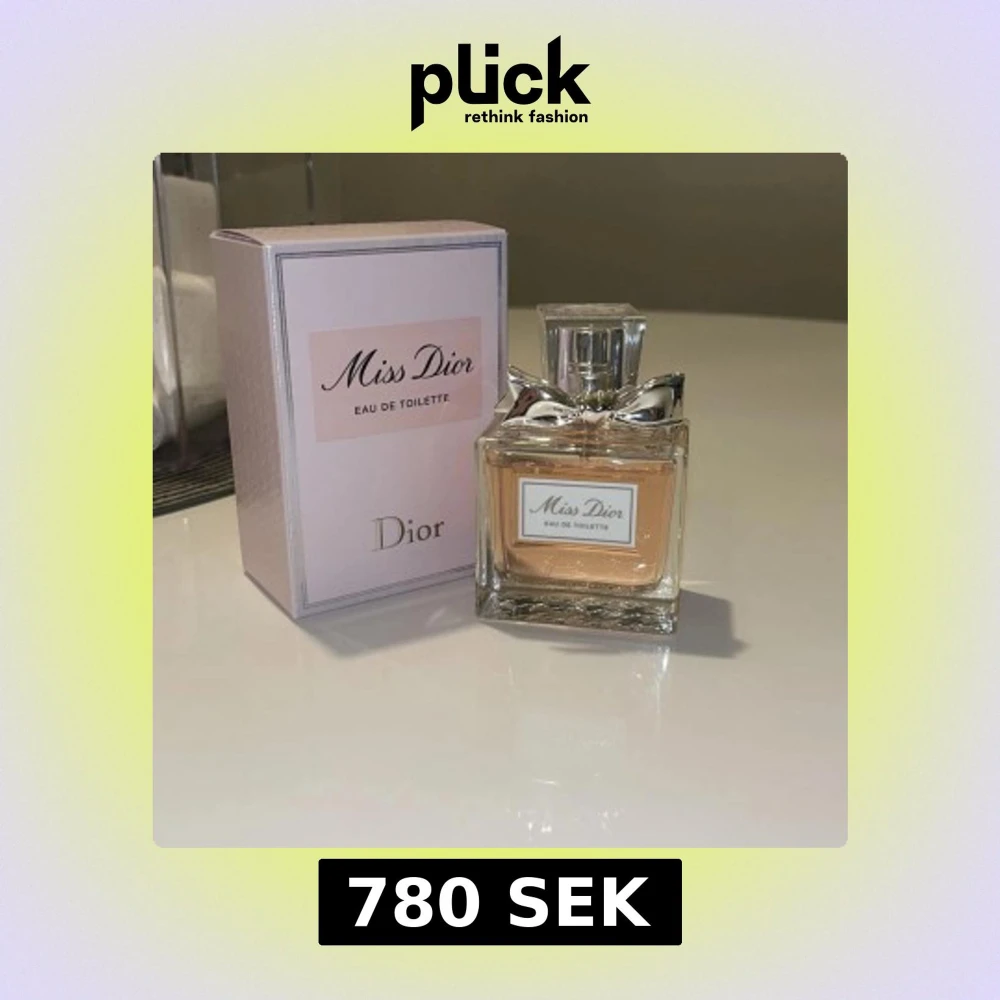 Miss Dior Eau de Toilette från Dior i en elegant fyrkantig glasflaska med silverfärgad rosett och transparent lock. Parfymen är ljusrosa och kommer i en stilren ljusrosa kartong. Flaskan rymmer 50 ml och utstrålar lyxig och feminin känsla.