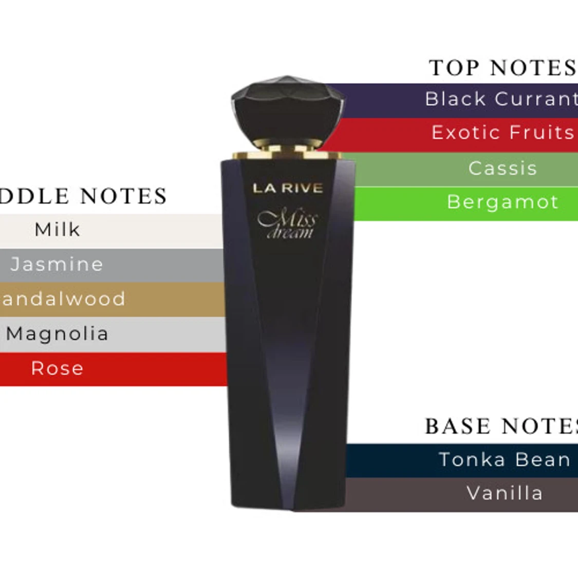La Rive Miss Dream parfym. Doften har toppnoter av svarta vinbär, exotiska frukter, cassis och bergamott. Mellannoter inkluderar mjölk, jasmin, sandelträ, magnolia och ros. Basnoter av tonkaböna och vanilj. Den luktar riktigt gott och har använts sparsamt! OBS sista bilden visar hur mycket finns.