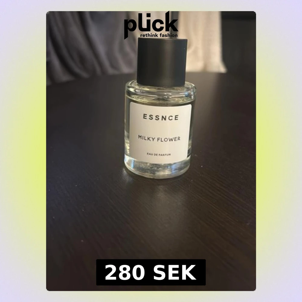 En stilren parfymflaska från Essnce med doften Milky Flower. Flaskan är genomskinlig med en svart cylinderformad kork och vit etikett med svart text. Innehållet är en Eau de Parfum som ger en elegant och modern känsla.