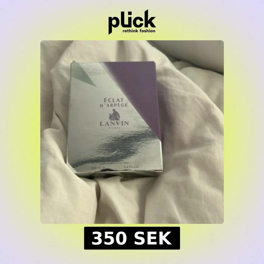 Säljer en 100 ml flaska Éclat d'Arpège Eau de Parfum från Lanvin. Parfymen kommer i en elegant, genomskinlig glasflaska med vit kork och har en stilren, silvrig förpackning med lila detaljer. En klassisk och feminin doft från ett välkänt franskt märke.