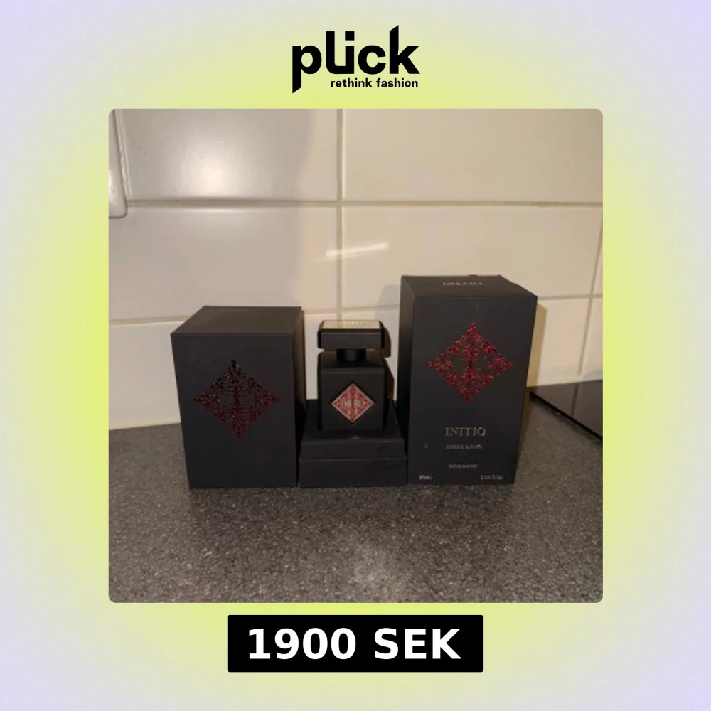 Elegant parfym från Initio i en stilren svart flaska med röda detaljer. Flaskan rymmer 90 ml och kommer i en matchande svart kartong med dekorativa röda mönster. Perfekt för den som söker en lyxig doftupplevelse.
