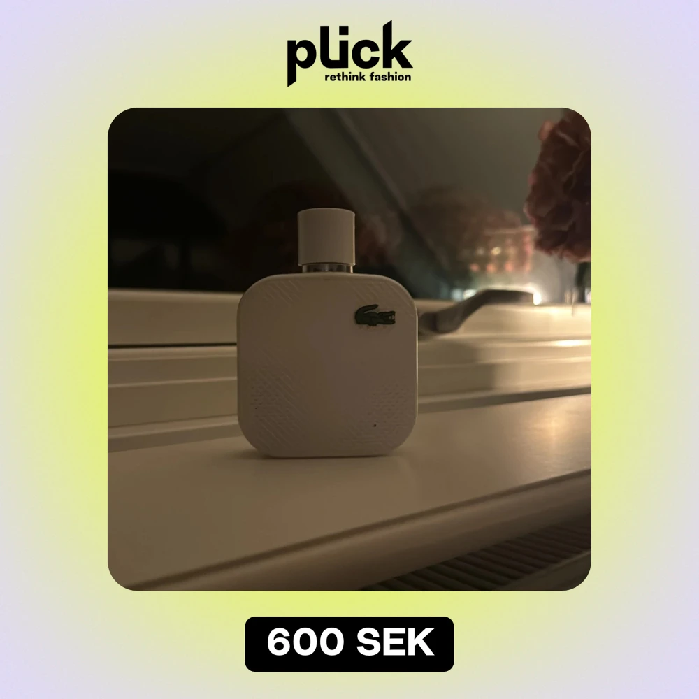 Säljer en stilren vit parfymflaska från Lacoste. Flaskan har en fyrkantig form med rundade hörn och pryds av den klassiska Lacoste-loggan i metall. Perfekt för den som gillar en fräsch och sportig doft. Passar både till vardags och fest!