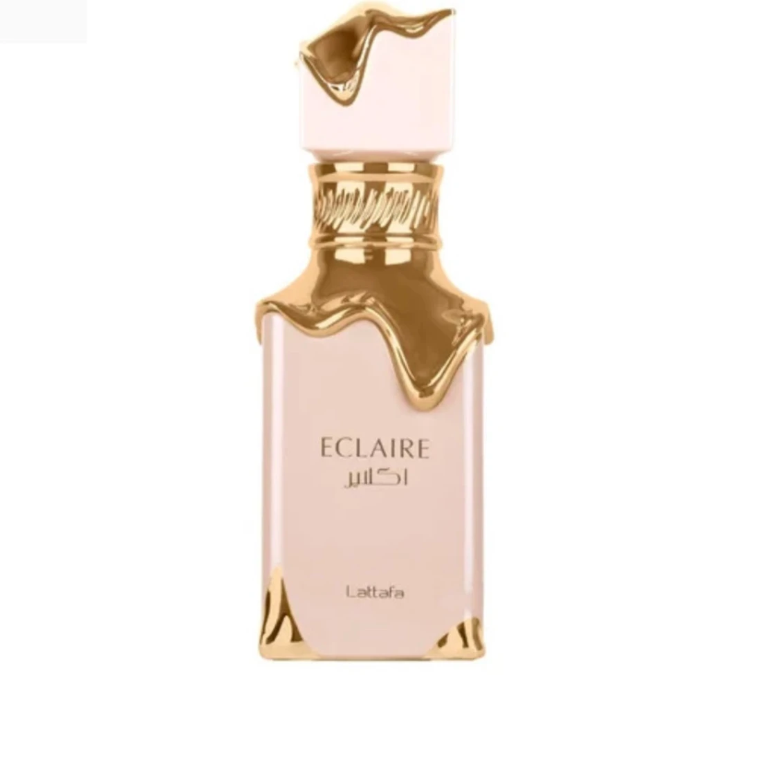 Lyxig parfymflaska från Lattafa i ljusrosa glas med unika guldfärgade detaljer som ser ut att rinna ner över flaskan. Flaskan har en fyrkantig form och elegant design med texten Eclaire på framsidan. ORDINARE PRIS: 700