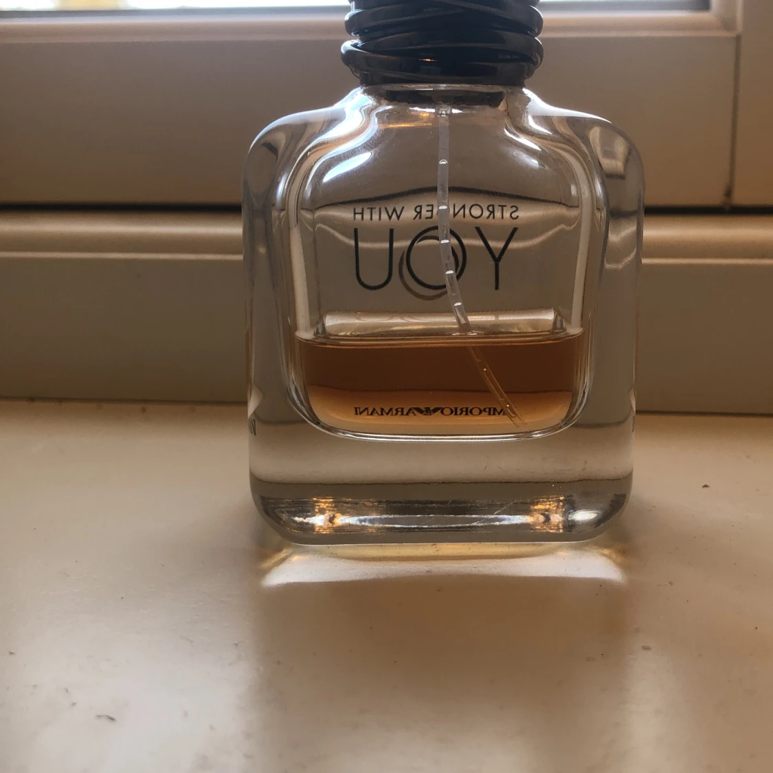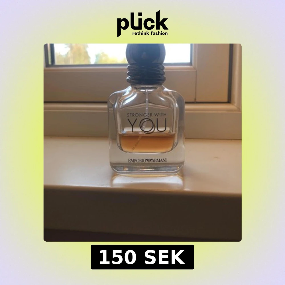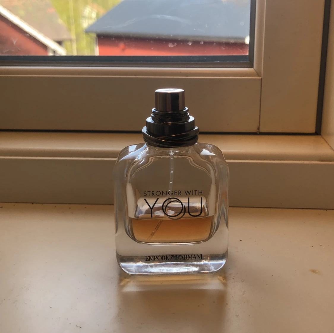 En stilren herrparfym i glasflaska med svart rund kork. Doften är Stronger With You från Emporio Armani, känd för sin varma och kryddiga karaktär. Flaskan har en transparent design med logotypen tryckt på framsidan. 15 ml av 30