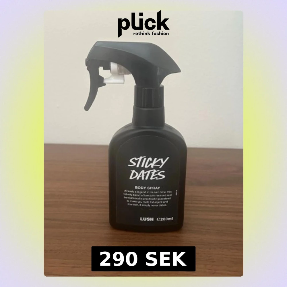Sticky Dates Body Spray från Lush i en svart plastflaska med spraymunstycke. Doften är en söt och krämig blandning av dadel, benzoin och sandelträ. Flaskan rymmer 200 ml och har en modern, stilren design med vit text på svart bakgrund. Ca 80-90% kvar.
