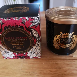 Varit tänt i ca 2 timmar och ljuset har en brinntid på 60 timmar..Inköpt på Åhléns för 399:- Ett handgjort doftljus i lyxig presentförpackning. MOR Emporium Fragrant Soy Candle Blood Orange har en doft av rubinröd blodapelsin med blommiga noter av jasmin, ros och linjekonvalj. Ljuset är tillverkat i sojavax och har en blyfri bomullsveke. Vaxet är svart, färgat av kol. Doftljuset har en brinntid på 60 h.