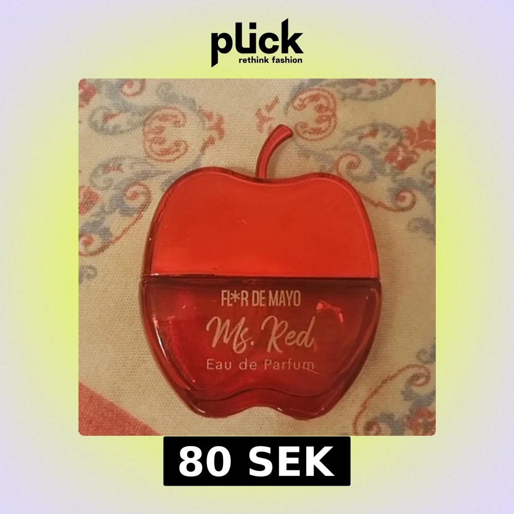 En söt parfym i en äppelformad röd flaska med lock och stilk. Flaskan är kompakt och har en glansig finish. Parfymen heter Ms. Red och är en Eau de Parfum, perfekt för dig som gillar lekfull design och fruktiga dofter. Båda för 80 kr
