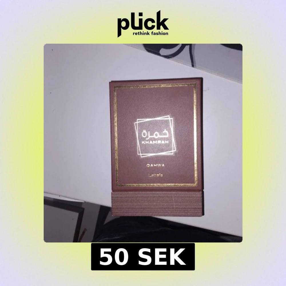 Lattafa Khamrah Qahwa parfym i en lyxig brun förpackning med gulddetaljer. Boxen har en elegant design med arabiska och engelska texter. Perfekt för dig som gillar exklusiva dofter och snygg presentation. Helt tom
