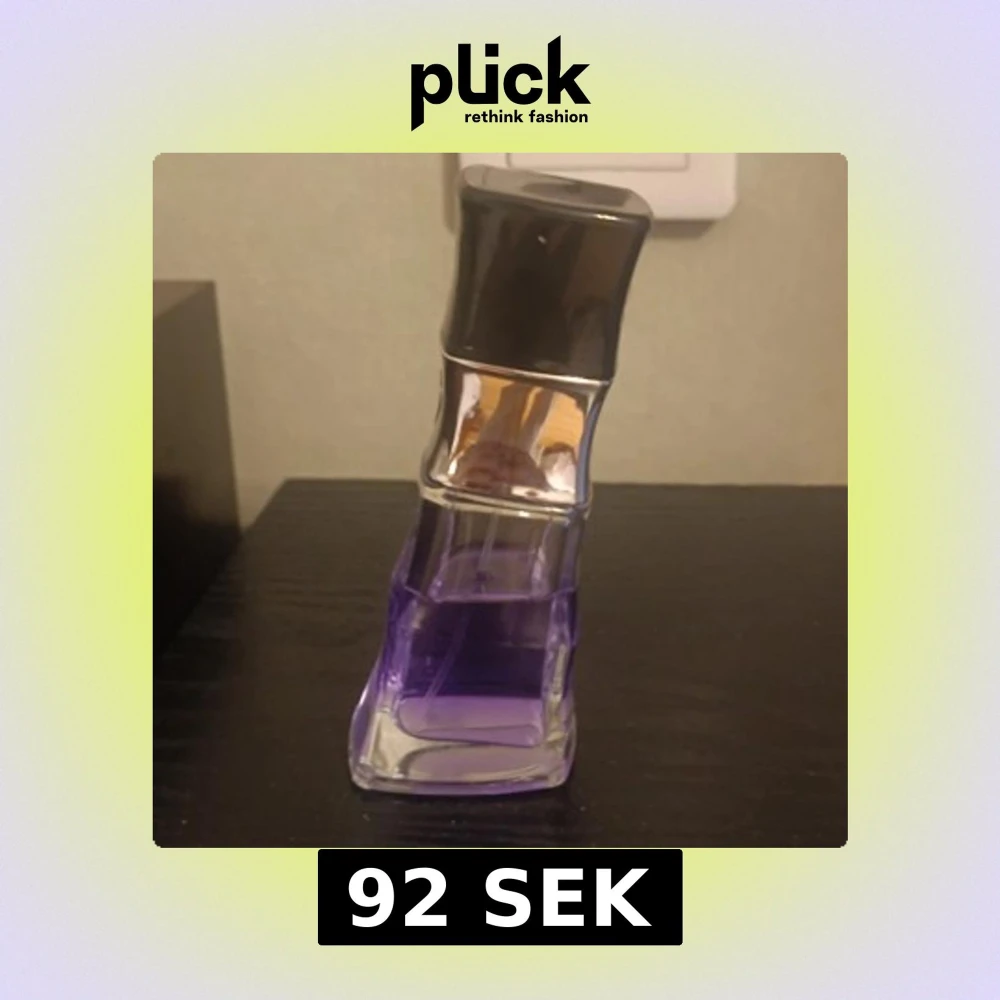 Snygg parfymflaska med lila innehåll och unik design. Perfekt för dig som vill sticka ut med din stil. Märke och volym framgår inte på flaskan.