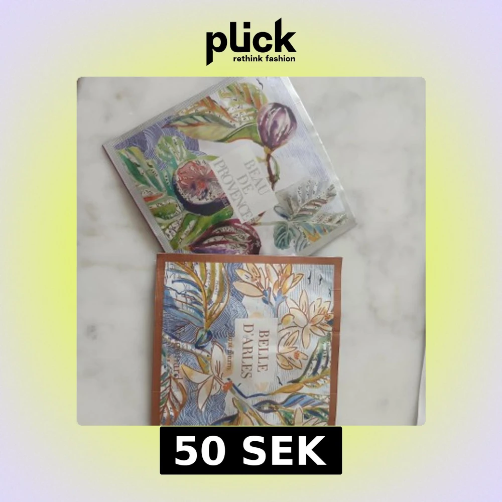 Två färgglada parfymprover från Fragonard: Beau de Provence med noter av bergamott, grapefrukt, fikon, mynta, basilika och ylang ylang samt Belle d'Arles. Proverna kommer i små, platta påsar med konstnärliga blommönster i lila, grönt, blått och guld.