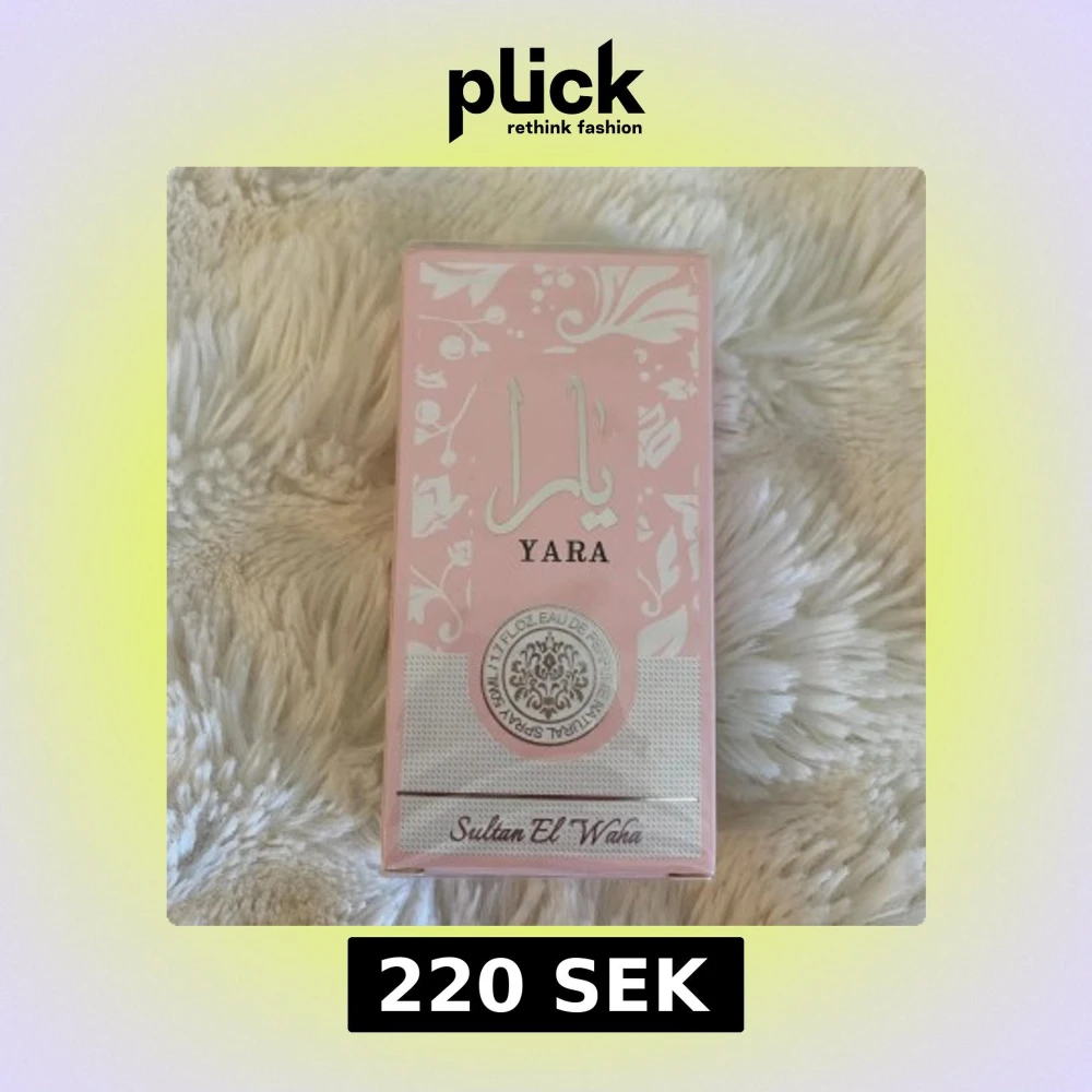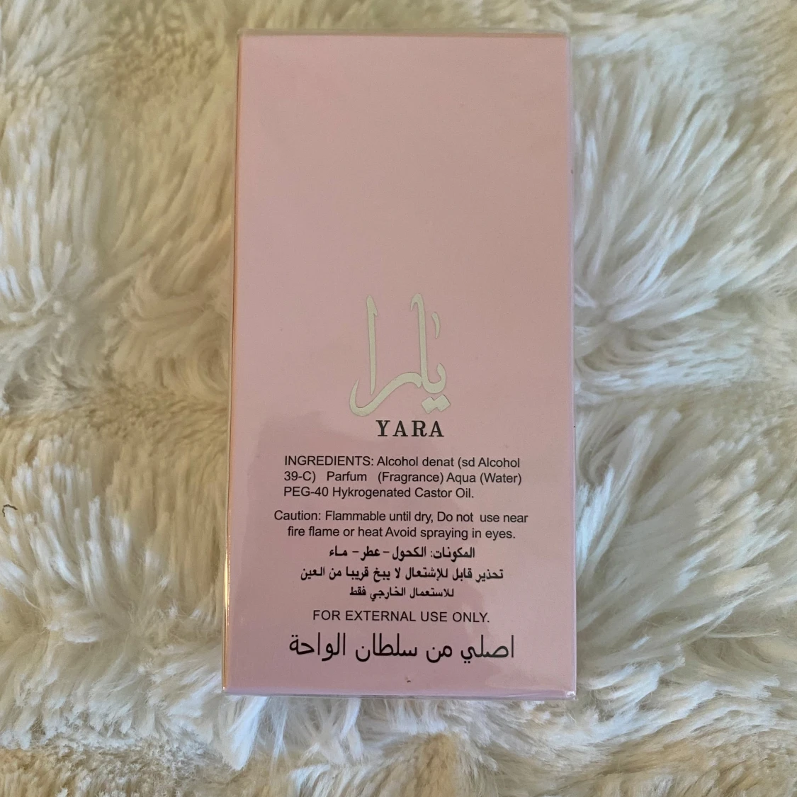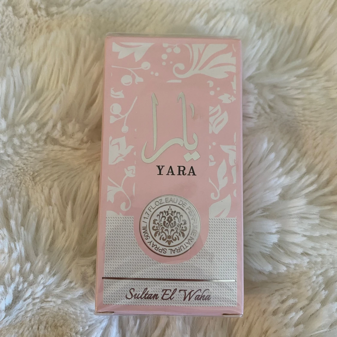 Säljer en parfym vid namn Yara från Sultan El Waha. Förpackningen är ljusrosa med vita dekorativa mönster och text i både arabiska och engelska. Flaskan innehåller 100 ml Eau de Parfum och har en elegant och feminin design. 💕