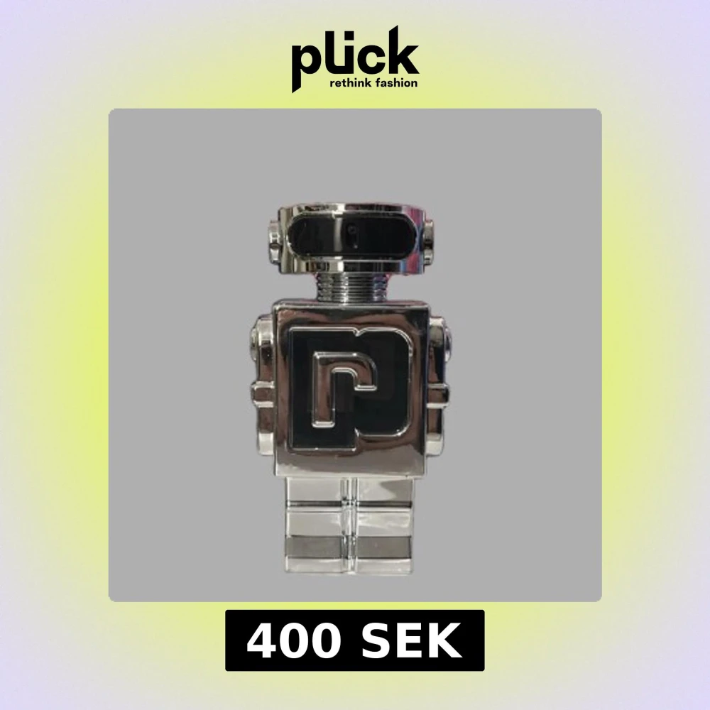 Säljer en futuristisk parfymflaska i form av en robot från Paco Rabanne. Flaskan är i silverfärgad metall med svarta detaljer och rymmer 100 ml av doften Phantom. Kanke är kvar 70ml