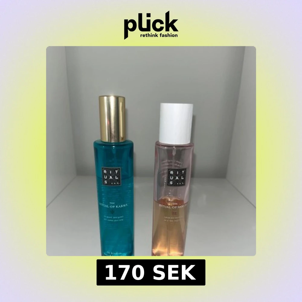 Två parfymer från Rituals: The Ritual of Karma i en turkos flaska med guldfärgat lock och The Ritual of Sakura i en rosa flaska med vitt lock. Ny pris 239 st. En är halvfull och en är över halva🥰 Går att köpa separat men säljer helst ihop🩷