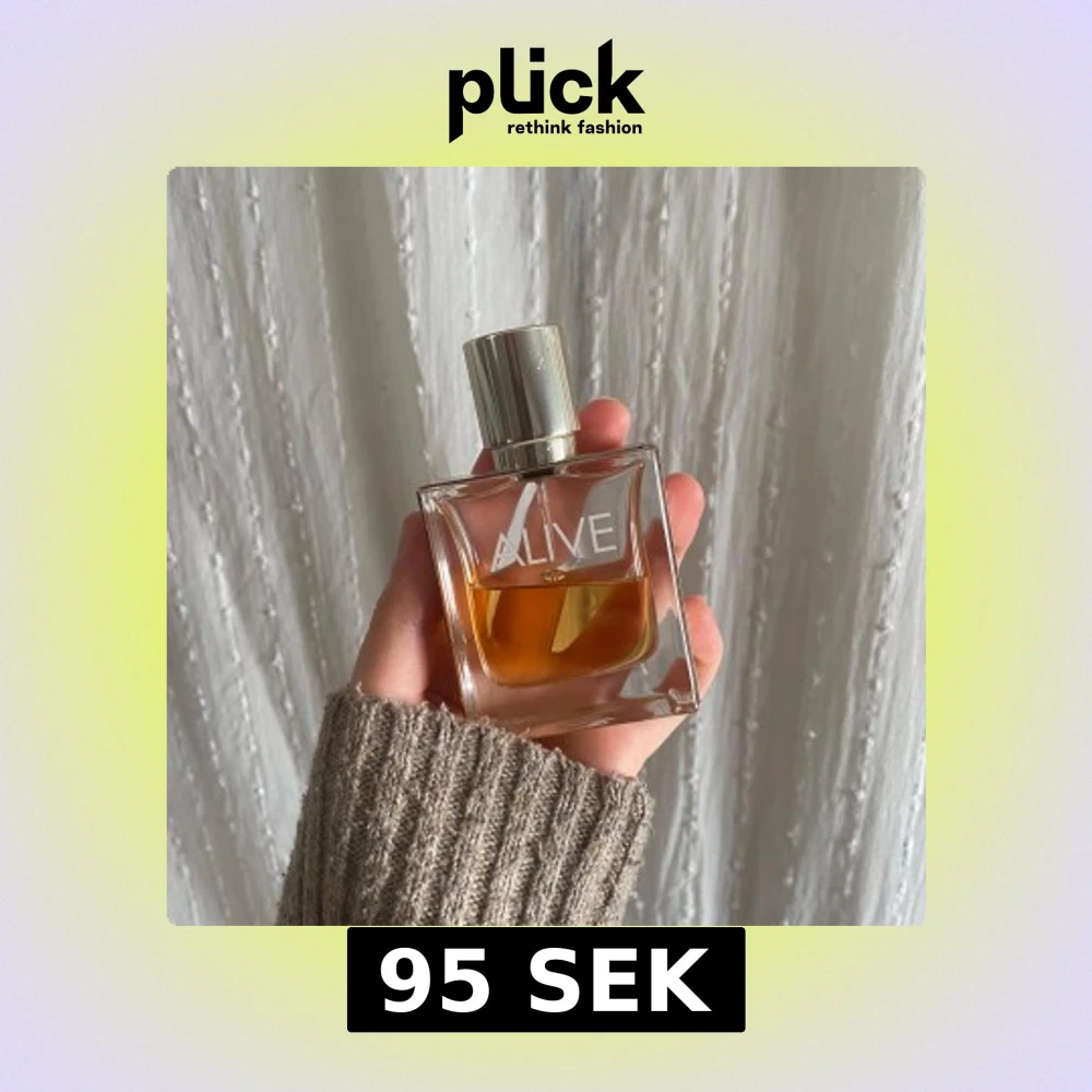 30 ml. Halva flaskan kvar. ALIVE parfym från Hugo Boss i en elegant, rektangulär glasflaska med silvrigt lock. Doften har en varm bärnstensfärgad vätska och flaskan har en stilren design med vit text. Perfekt för dig som gillar lyxiga och moderna dofter.